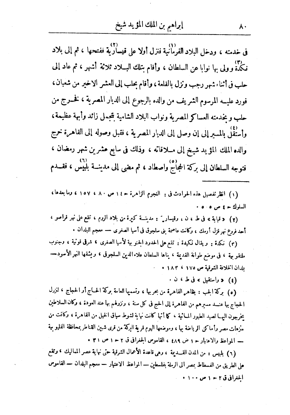 في خدمته، ودخل البلاد القرمانية فنزل أولا على قيسارية ففتحها، ثم إلى بلاد نكدة وولى بها نوابا عن السلطان، وأقام بتلك البلاد ثلاثة أشهر، ثم عاد إلى حلب في أثناء شهر رجب ونزل بالقلعة، وأقام بحلب إلى العشر الأخير من شعبان، فورد عليه المرسوم الشريف من والده بالرجوع إلى الديار المصرية، فخرج من حلب وبخدمته العساكر المصرية ونواب البلاد الشامية بتجمل زائد وأبهة عظيمة، واستقل بالمسير إلى إن وصل إلى الديار المصرية، فقبل وصوله إلى القاهرة خرج والده الملك المؤيد شيخ إلى ملاقاته، وذلك في سابع عشرين شهر رمضان، فتوجه السلطان إلى بركة الحجاج واصطاد، ثم مضى إلى مدينة بلبيس، فقدم