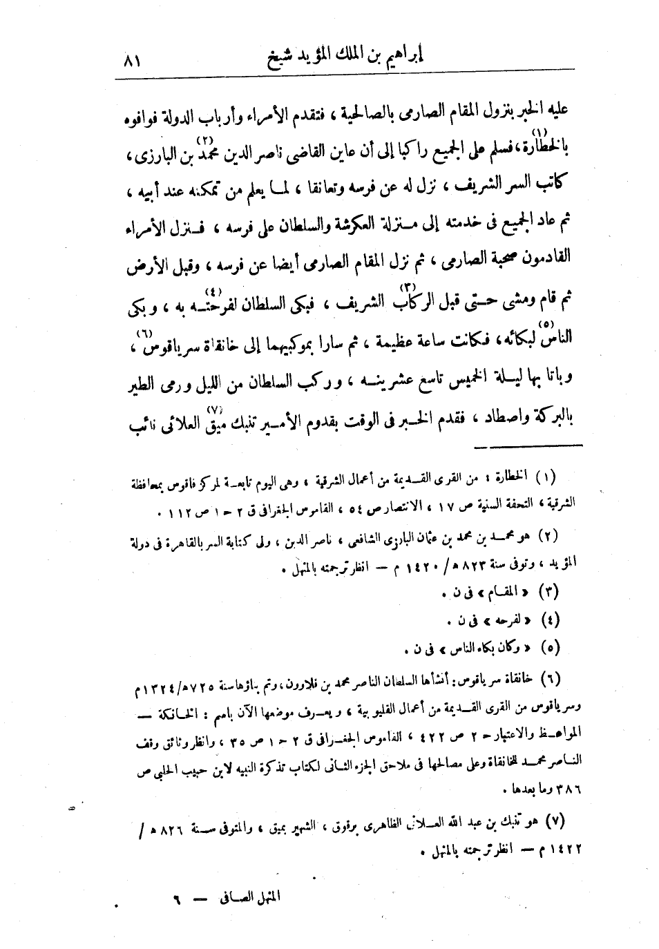 عليه الحبر بنزول المقام الصارمي بالصالحية، فتقدم الأمراء وأرباب الدولة فوافوه بالخطارة، فسلم على الجميع راكبا إلى أن عاين القاضي ناصر الدين محمد بن البارزي، كاتب السر الشريف، نزل له عن فرسه وتعانقا، لما يعلم من تمكنه عند أبيه، ثم عاد الجميع في خدمته إلى منزلة العكرشة والسلطان على فرسه، فنزل الأمراء القادمون صحبة الصارمي، ثم نزل المقام الصارمي أيضا عن فرسه، وقبل الأرض ثم قام ومشى حتى قبل الركاب الشريف، فبكى السلطان لفرحته به، وبكى الناس لبكائه، فكانت ساعة عظيمة، ثم سارا بموكبيهما إلى خانقاه سرياقوس، وباتا بها ليلة الخميس تاسع عشرينه، وركب السلطان من الليل ورمى الطير بالبركة واصطاد، فقدم الخبر في الوقت بقدوم الأمير تنبك ميق العلائي نائب