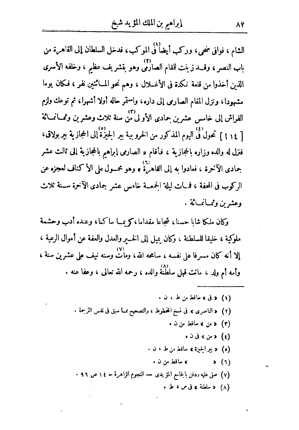 الشام، فوافى ضحى، وركب أيضا في الموكب، فدخل السلطان إلى القاهرة من باب النصر، وقد زينت للمقام الصارمي وهو بتشريف عظيم، وخلفه الأسرى الذين أخذوا من قلعة نكدة في الأغلال، وهم نحو المائتين نفر، فكان يوما مشهودا، ونزل المقام الصارمي إلى داره، واستمر حاله أولا أشهرا، ثم توعك ولزم الفراش إلى خامس عشرين جمادى الأولى من سنة ثلاث وعشرين وثمانمائة تحول في اليوم المذكور من الخروبية ببير الجيزة إلى الحجازية ببير بولاق، فنزل له والده وزاره بالحجازية، فأقام الصارمي إبراهيم بالحجازية إلى ثالث عشر جمادى الآخرة، فعادوا به إلى القاهرة وهو محمول على الأكتاف لعجزه عن الركوب في المحفة، فمات ليلة الجمعة خامس عشر جمادى الآخرة سنة ثلاث وعشرين وثمانمائة.