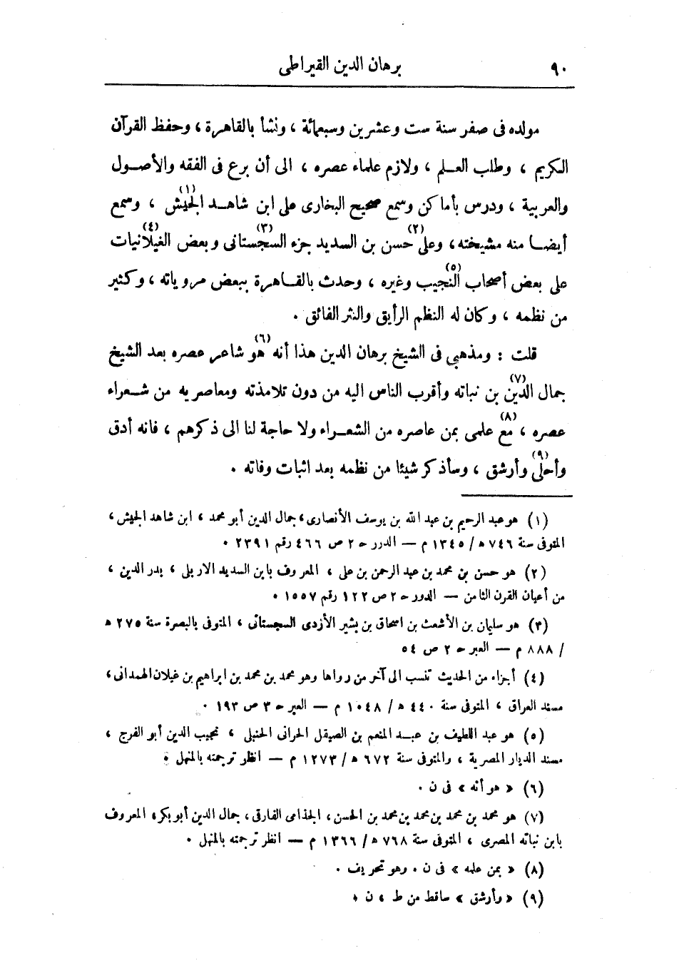 قلت: ومذهبي في الشيخ برهان الدين هذا أنه هو شاعر عصره بعد الشيخ جمال الدين بن نباته وأقرب الناس إليه من دون تلامذته ومعاصريه من شعراء عصره، مع علمي بمن عاصره من الشعراء ولا حاجة لنا إلى ذكرهم، فإنه أدق وأحلى وأرشق، وسأذكر شيئا من نظمه بعد إثبات وفاته.