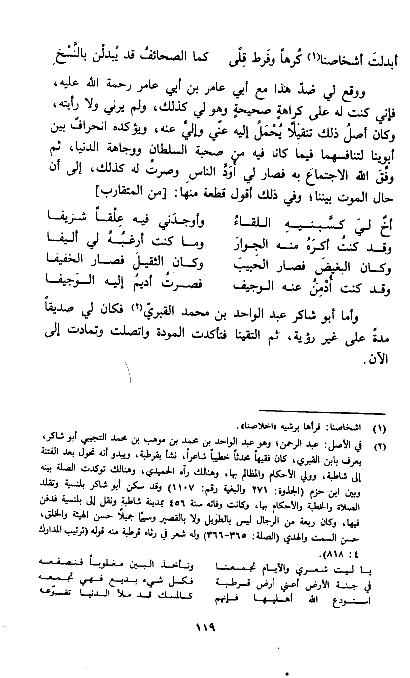 أبدلت أشخاصنا (1) كرهاً وفرط قلى ... كما الصحائف قد يبدلن بالنسخ ووقع لي ضد هذا مع أبي عامر بن أبي عامر رحمة الله عليه، فإني كنت له على كراهة صحيحة وهو لي كذلك، ولم يرني ولا رأيته، وكان أصل ذلك تنقيلاً يحمل إليه عني وإلي عنه، ويؤكده انحراف بين أبوينا لتنافسهما فيما كانا فيه أود الناس وصرت له كذلك، إلى ان حال الموت بيننا؛ وفي ذلك أقول قطعة منها: [من المتقارب]