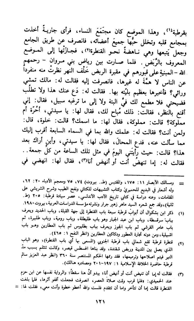 بقرطبة (1) ، وهذا الموضع كان مجتمع النساء، فرأى جارية أخذت بمجامع قلبه وتخلل حبها جميع اعضائه، فانصرف عن طريق الجامع وجعل يتبعها وهي ناهضة نحو القنطرة (2) ، فجازتها إلى الموضع المعروف بالربض. فلما صارت بين رياض بني مروان - رحمهم الله - المبنية على قبورهم في مقبرة الربض خلف النهر نظرت منه منفرداً عن الناس لا همة له غيرها، فانصرفت إليه فقالت له: مالك تمشي ورائي فأخبرها بعظيم بليته بها. فقالت له: دع عنك هذا ولا تطلب فضيحتي فلا مطمع لك في البتة ولا إلى ما ترغبه سبيل، فقال: إني أقنع بالنظر، فقالت: ذلك مباح لك، فقال لها: يا سيدتي، أحرة أم مملوكة قالت: مملوكة، فقال لها: ما اسمك. قالت: خلوة، قال: ولمن أنت فقالت له: علمك والله بما في السماء السابعة أقرب إليك مما سألت عنه، فدع المحال، فقال لها: يا سيدتي، وأين أراك بعد هذا قالت: حيث رأيتني اليوم في مثل تلك الساعة من كل جمعة.. فقالت له: إما تنهض أنت أو انهض أنا (3) ، فقال لها: انهضي في