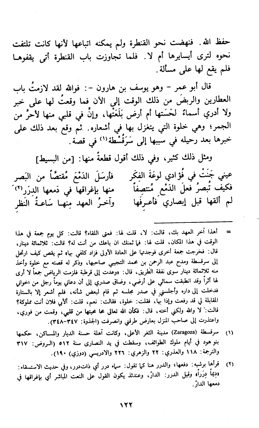 حفظ الله. فنهضت نحو القنطرة ولم يمكنه اتباعها لأنها كانت تلتفت نحوه لترى أيسايرها أم لا. فلما تجاوزت باب القنطرة أتى يقفوها فلم يقع لها على مسألة.