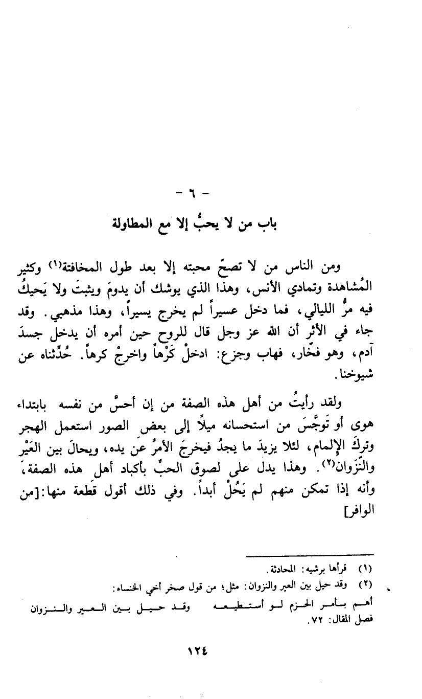 ولقد رأيت من أهل هذه الصفة من إن أحس من نفسه بابتداء هوى أو توجس من استحسانه ميلاً إلى بعض الصور استعمل الهجر وترك الإلمام، لئلا يزيد ما يجد فيخرج الأمر عن يديه، ويحال بين العير والنزوان (2) . وهذا يدل على لصوق الحب بأكباد أهل هذه الصفة، وأنه إذا تمكن منهم لم يحل أبداً. وفي ذلك أقول قطعة منها: [من الوافر]
