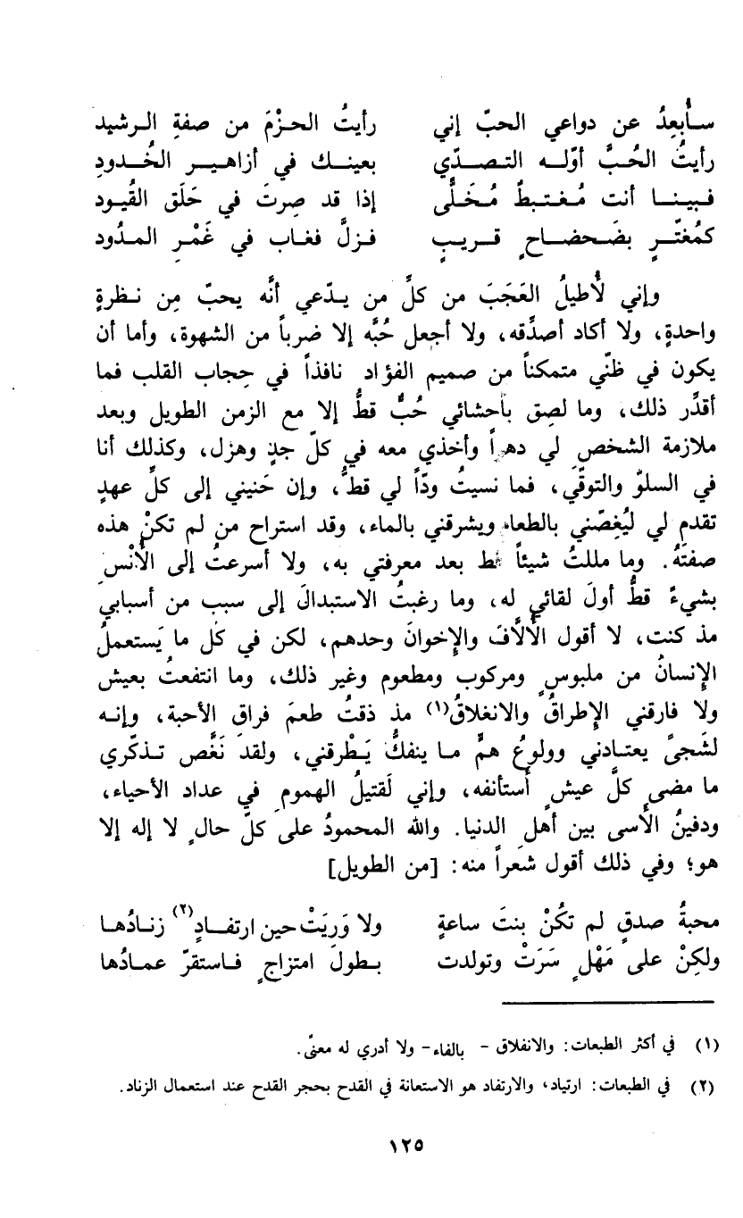 كمغتر بضحضاح قريب ... فزل فغاب في غمر المدود وإني لأطيل العجب من كل من يدعي أنه يحب من نظرة واحدة، ولا أكاد أصدقه، ولا أجعل حبه إلا ضرباً من الشهوة، وأما أن يكون في ظني متمكناً من صميم الفؤاد نافذاً في حجاب القلب فما أقدر ذلك، وما لصق بأحشائي حب قط إلا مع الزمن الطويل وبعد ملازمة الشخص لي دهراً وأخذي معه في كل جد وهزل، وكذلك أنا في السلو والتوقي، فما نسيت وداً لي قط، وإن حنيني إلى كل عهد تقدم لي ليغصني بالطعام ويشرقني بالماء، وقد استراح من لم تكن هذه صفته. وما مللت شيئاً قط بعد معرفتي به، ولا أسرعت إلى الأنس مذ كنت، لا أقول الألاف والإخوان وحدهم، لكن في كل ما يستعمل الإنسان من ملبوس ومركوب ومطعوم وغير ذلك، وما انتفعت بعيش ولا فارقني الإطراق والانغلاق (1) مذ ذقت طعم فراق الأحبة، وإنه لشجى يعتادني وولوع هم ما ينفعك يطرقني، ولقد نغص تذكري ما مضى كل عيش استأنفه، وإني لقتيل الهموم في عداد الأحياء، ودفين الأسى بين أهل الدنيا. والله المحمود على كل حال لا إله إلا هو؛ وفي ذلك أقول شعراً منه: [من الطويل]