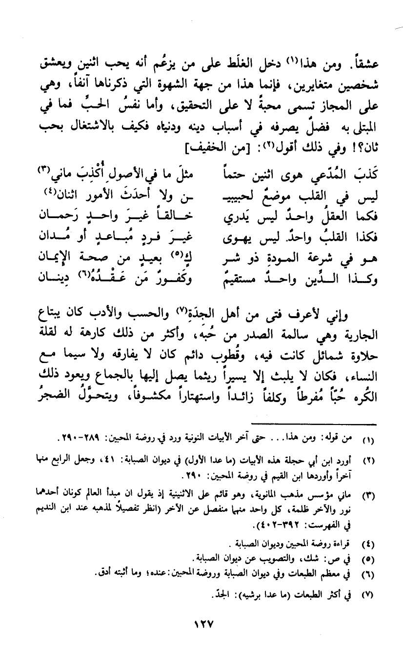 وكذا الدين واحد مستقيم ... وكفور من عقدة (6) دينان وإني لأعرف فتى من أهل الجدة (7) والحسب والأدب كان يبتاع الجارية وهي سالمة الصدر من حبه، وأكثر من ذلك كارهة له لقلة حلاوة شمائل كانت فيه، وقطوب دائم كان لا يفارقه ولا سيما مع النساء، فكان لا يلبث إلا يسيراً ريثما يصل إليها بالجماع ويعود ذلك الكره حباً مفرطاً وكلفاً زائداً واستهتاراً مكشوفاً، ويتحول الضجر