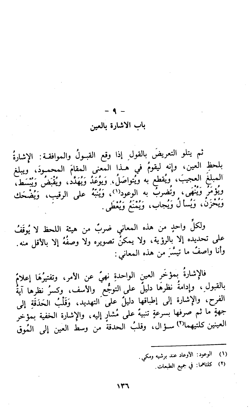 ثم يتلو التعريض بالقول إذا وقع القبول والموافقة: الإشارة بلحظ العين، وإنه ليقوم في هذا المعنى المقام المحمود، ويبلغ المبلغ العجيب، ويقطع به ويتواصل، ويوعد ويهدد، ويقبض ويبسط، ويؤمر وينهى، وتضرب به الوعود (1) ، وينبه على الرقيب، ويضحك ويحزن، ويسأل ويجاب، ويمنع ويعطى.