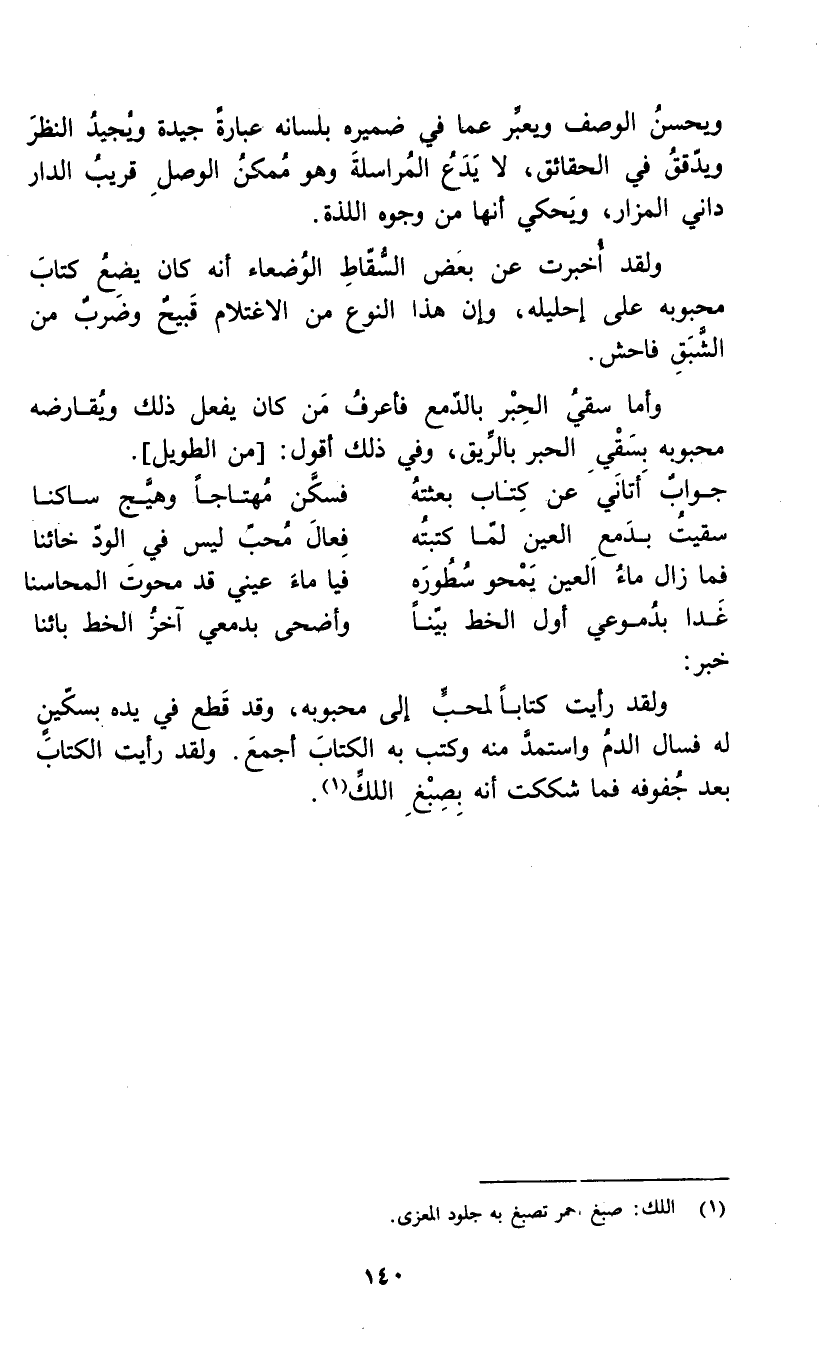 ولقد رأيت كتاب المحب إلى محبوبه، وقد قطع في يده بسكين له فسال الدم واستمد منه وكتب به الكتاب أجمع. ولقد رأيت الكتاب بعد جفوفه فما شككت انه بصبغ اللك (1) .