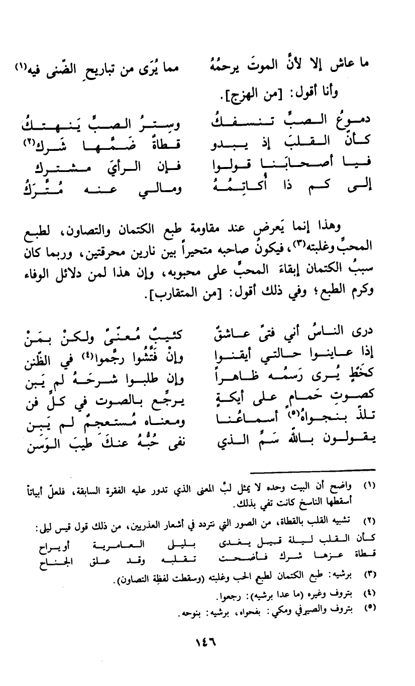 إلى كم ذا أكاتمه ... ومالي عنه مترك وهذا إنما يعرض عند مقاومة طبع الكتمان والتصاون، لطبع المحب وغلبته (3) ، فيكون صاحبه متحيزاً بين نارين محرقتين، وربما كان سبب الكتمان إبقاء المحب على محبوبه، وإن هذا لمن دلائل الوفاء وكرم الطبع؛ وفي ذلك أقول: [من المتقارب] .