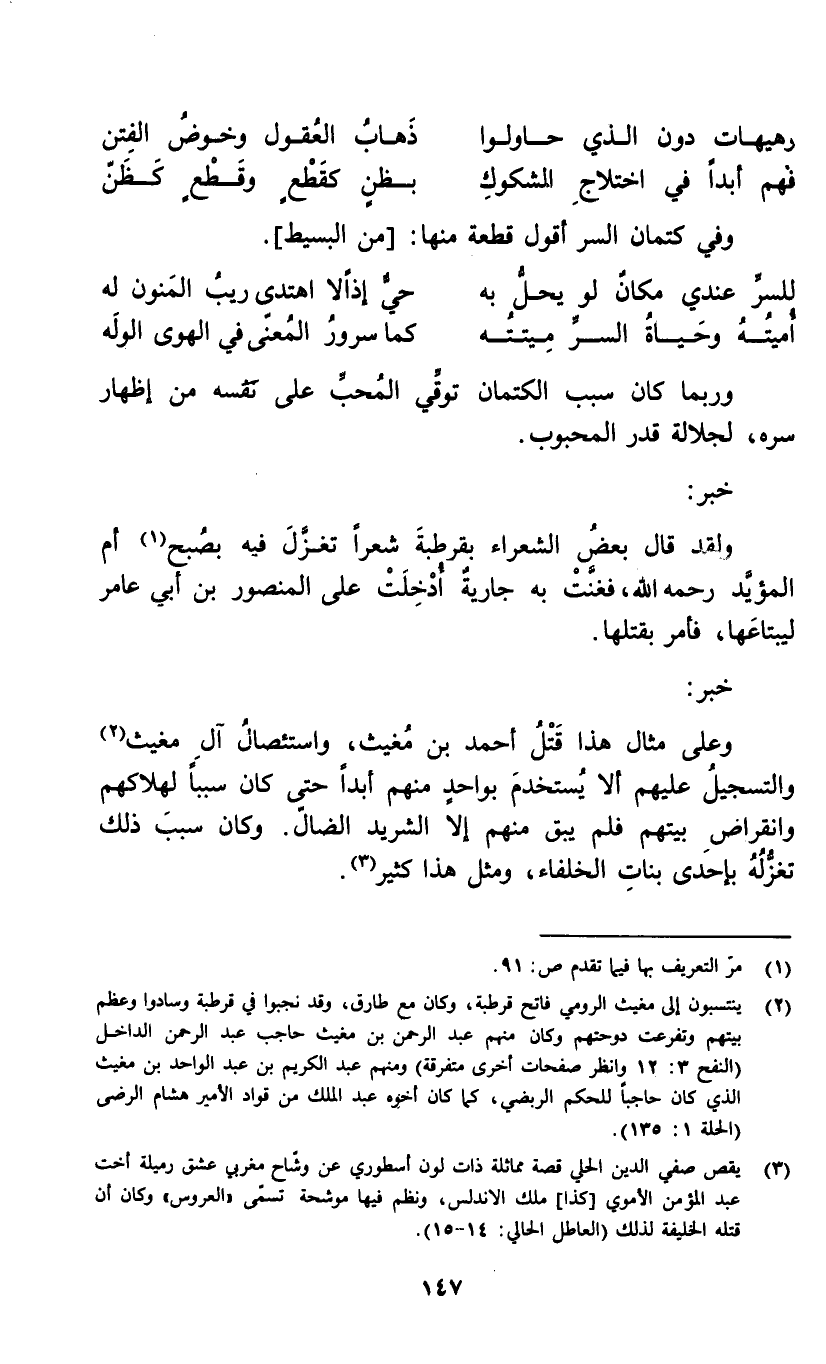 وعلى مثال هذا قتل أحمد بن مغيث، واستئصال آل مغيث (2) والتسجيل عليهم ألا يستخدم بواحد منهم أبداً حتى كان سبباً لهلاكهم وانقراض بيتهم فلم يبق منهم إلا الشريد الضال. وكان سبب ذلك تغزله بإحدى بنات الخلفاء، ومثل هذا كثير (3) .