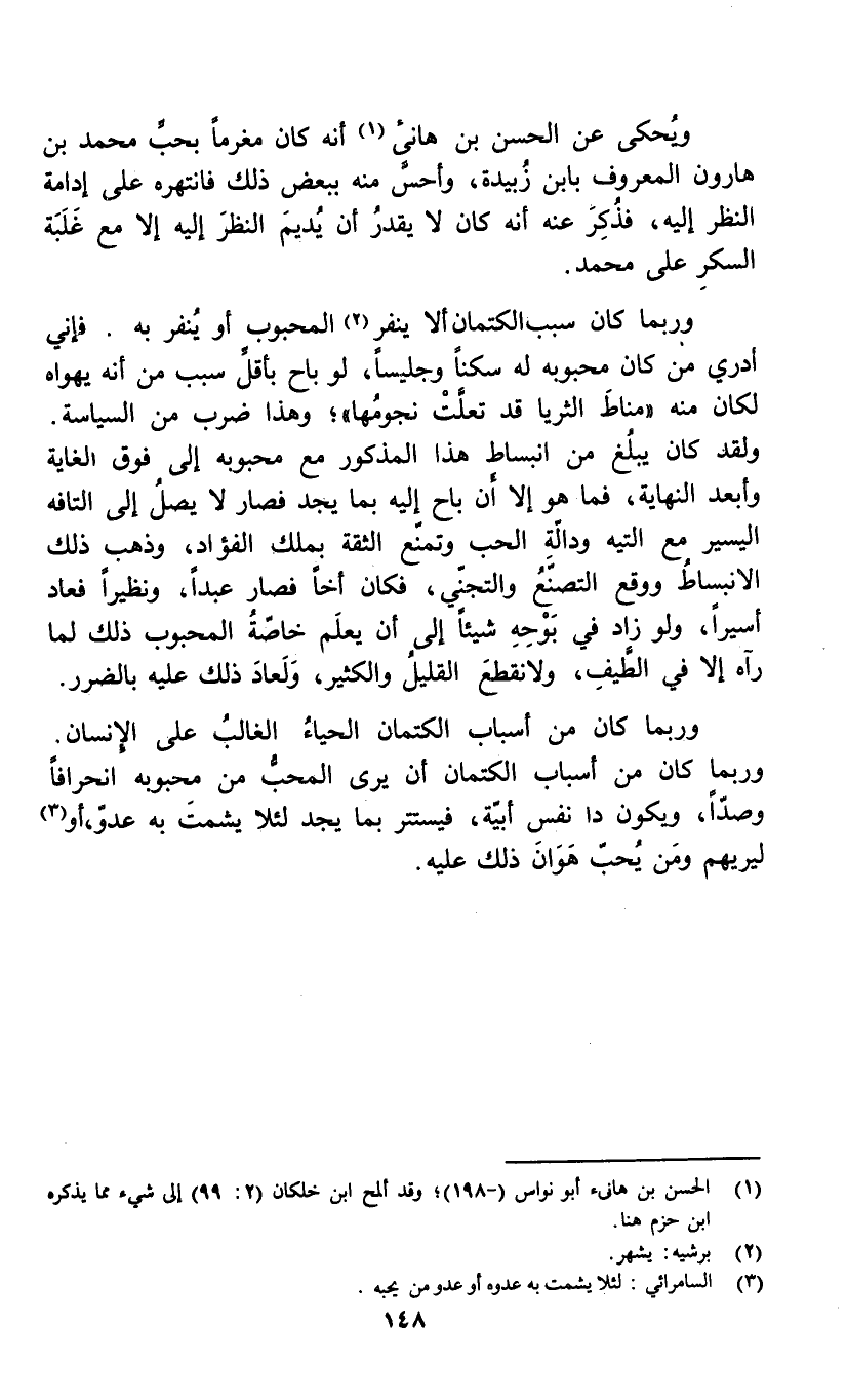 وربما كان سبب الكتمان ألا ينفر (2) المحبوب أو ينفر به. فإني أدري من كان محبوبه له سكناً وجليساً، لو باح بأقل سبب من أنه يهواه لكان منه " مناط الثريا قد تعلت نجومها "؛ وهذا ضرب من السياسة. ولقد كان يبلغ من انبساط هذا المذكور مع محبوبه إلى فوق الغاية وأبعد النهاية، فما هو إلا ان أباح إليه بما يجد فصار لا يصل إلى التافه اليسير مع التيه ودالة الحب وتمنع الثقة بملك الفؤاد، وذهب ذلك الانبساط ووقع التصنع والتجني، فكان أخاً فصار عبداً، ونظيراً فعاد أسيراً، ولو زاد في بوحه شيئاً إلى أن يعلم خاصة المحبوب ذلك لما رآه إلا في الطيف، ولا نقطع القليل والكثير، ولعاد ذلك عليه بالضرر.