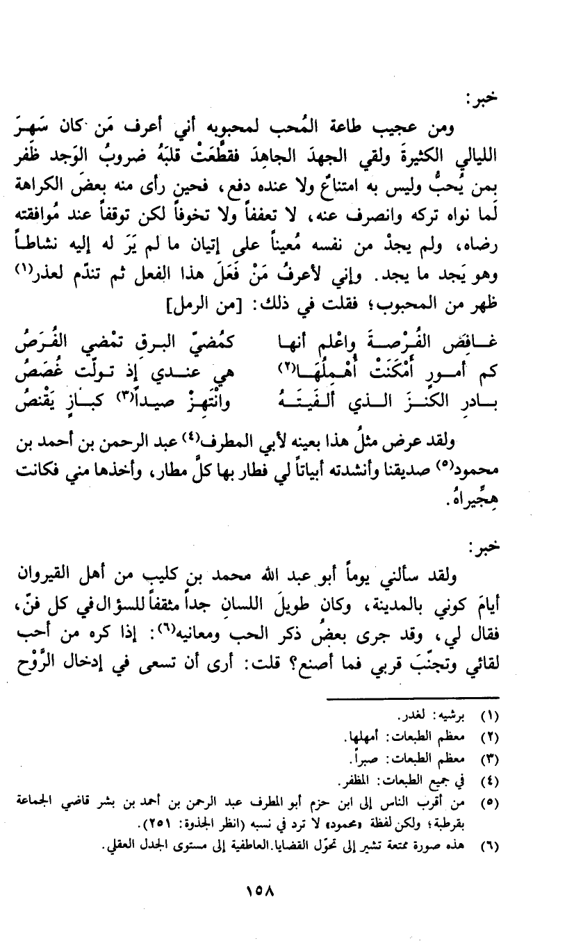 ولقد سألني يوماً أبو عبد الله محمد بن كليب من أهل القيروان أيام كوني بالمدينة، وكان طويل اللسان جداً مثقفاً للسؤال في كل فن فقال لي، وقد جرى بعض ذكر الحب ومعانيه (6) : إذا كره من أحب لقائي وتجنب قربي فما أصنع قلت: أرى أن تسعى في إدخال الروح