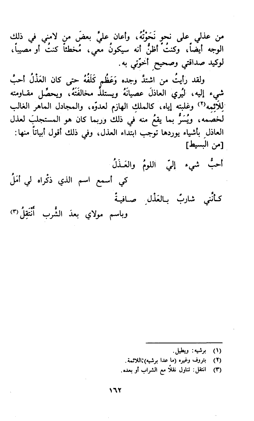 ولقد رأيت من اشتد وجده وعظم كلفه حتى كل العذل أحب شيء إليه، ليري العاذل عصيانه ويستلذ مخالفته، ويحصل مقاومته للأئمه (1) وغلبته إياه، كالملك الهازم لعدوه، والمجادل الماهر الغالب لخصمه، ويسر بما يقع منه في ذلك وربما كان هو المستجلب لعذل العاذل بأشياء يوردها توجب ابتداء العذل، وفي ذلك أقول أبياتاً منها: [من البسيط]