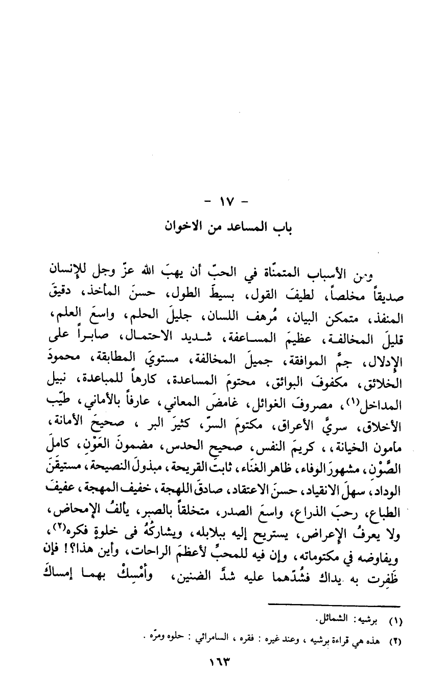 ومن الأسباب المتمناة في الحب ان يهب الله عز وجل للإنسان صديقاً مخلصاً، لطيف القول، بسيط الطول، حسن المأخذ، دقيق المنفذ، متمكن البيان، مرهف اللسان، جليل الحلم، واسع العلم، قليل المخالفة، عظيم المساعفة، شديد الاحتمال، صابراً على الإدلال، جم الموافقة، جميل المخالفة، مستوي المطابقة، محمود الخلائق، مكفوف البوائق، محتوم المساعدة، كارهاً للمباعدة، نبيل المداخل (1) ، مصروف الغوائل، غامض المعاني، عارفاً بالأماني، طيب الأخلاق، سري الأعراق، مكتوم السر، كثير البر، صحيح الأمانة، مأمون الخيانة، كريم النفس، صحيح الحدس، مضمون العون، كامل الصون، مشهور الوفاء، ظاهر الغناء، ثابت القريحة، مبذول النصيحة، مستيقن الوداد، سهل الانقياد، حسن الاعتقاد، صادق اللهجة، خفيف المهجة، عفيف الطباع، رحب الذراع، واسع الصدر، متخلقاً بالصبر، يألف الإمحاض، ولا يعرف الإعراض، يستريح إليه ببلابله، ويشاركه في خلوة فكره (2) ، ويفاوضه في مكتوماته، وإن فيه للمحب لأعظم الراحات، وأين هذا! فغن ظفرت به يداك فشدهما عليه شد الضنين، وأمسك بهما إمساك