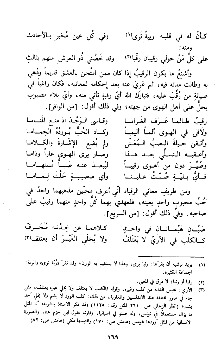 (2) على كل من حولي رقيبان رقبا ... وقد خصني ذو العرش منهم بثالث وأشنع ما يكون الرقيب إذا كان ممن امتحن بالعشق قديماً ودهي به وطالت مدته فيه، ثم عري عنه بعد إحكامه لمعانيه، فكان راغباً في صيانة من رقب عليه، فتبارك الله أي رقبة تأتي منه، وأي بلاء مصبوب يحل على أهل الهوى من جهته؛ وفي ذلك أقول: [من الوافر] .