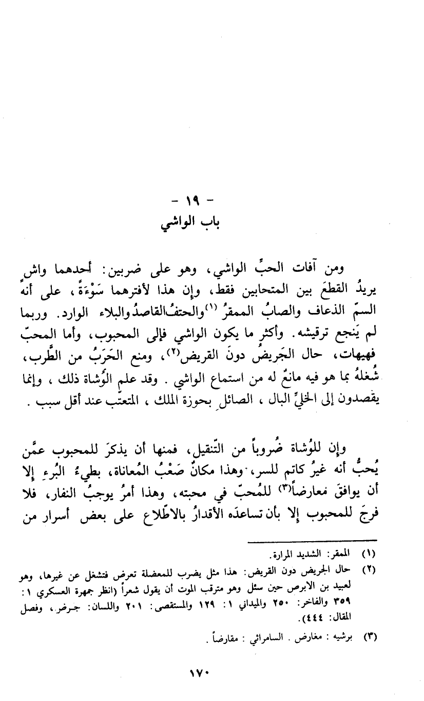 وإن للوشاة ضرورياً من التنقيل، فمنها أن يذكر للمحبوب عمن يحب أنه غير كاتم للسر، وهذا مكان صعب المعاناة، بطئ البرء إلا أن يوافق معارضاً (3) للمحب في محبته، وهذا أمر يوجب النفار، فلا فرج للمحبوب إلا بأن تساعده الأقدار بالاطلاع على بعض أسرار من