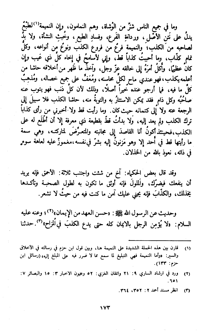 (1) قارن بين هذه الحملة الشديدة على النميمة هنا، وبين قول ابن حزم في رسالته في الأخلاق والسير: " واما النميمة فهي التبليغ لما سمع مما لا ضرر فيه على المبلغ إليه " (رسائل ابن حزم: 133) .