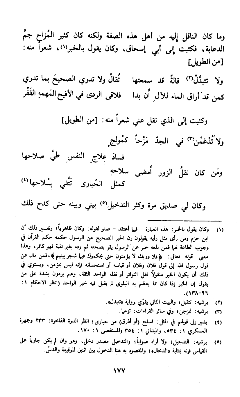 (1) وكان يقول بالخبر: هذه العبارة - فيما أعتقد - صنو لقوله: وكان ظاهرياً؛ وتفسير ذلك أن ابن حزم ومن رأى مثل رأيه يقولون إن الخبر الصحيح عن الرسول حكمه حكم القرآن في وجوب الطاعة لهما فمن بلغه خبر عن الرسول يقر بصحته ثم رده بغير تقية فهو كافر، وهذا معنى قوله تعالى: (فلا وربك لا يؤمنون حتى يحكموك فيما شجر بينهم) ، فمن مال عن قول رسول الله إلى قول فلان وفلان أو قياسه أو استحسانه فإنه ليس بمؤمن، ويستوي في ذلك أن يكون الخبر منقولاً نقل التواتر أو نقله الواحد الثقة، وهم يردون بشدة على من يقول إن الخبر إذا كان مما يعظم به البلوى لم يقبل فيه خبر الواحد (انظر الاحكام 1: 96 - 138) .