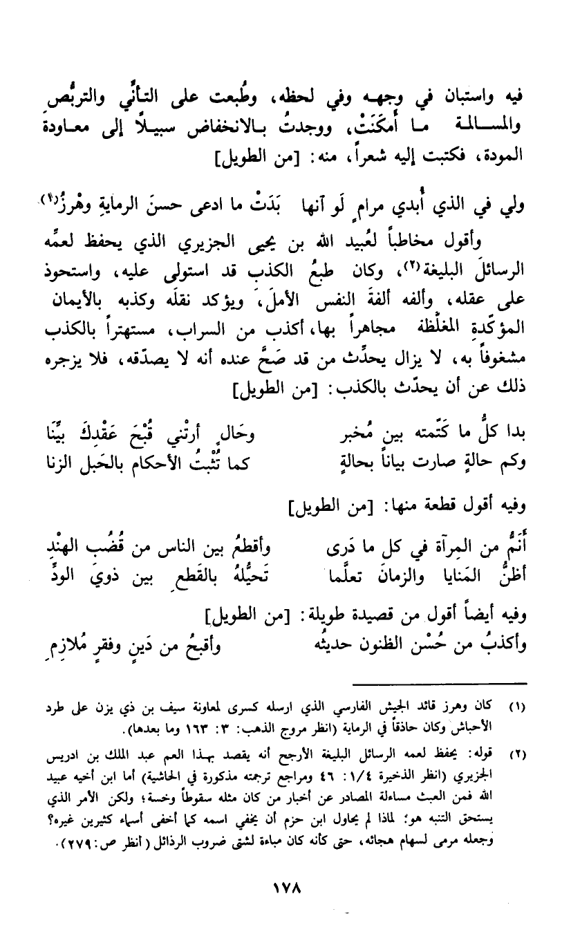 ولي في الذي أبدي مرام لو أنها ... بدت ما ادعى حسن الرماية وهرز (1) وأقول مخاطباً لعبيد الله بن يحيى الجزيري الذي يحفظ لعمه الرسائل البليغة (2) ، وكان طبع الكذب قد استولى عليه، واستحوذ على عقله، وألفه ألفة النفس الأمل، ويؤكد نقله وكذبه بالأيمان المؤكدة المغلظة مجاهراً بها، أكذب من السراب، مستهتراً بالكذب مشغوفاً به، لا يزال يحدث من قد صح عنده أنه لا يصدقه، فلا يزجره ذلك عن أن يحدث بالكذب: [من الطويل]