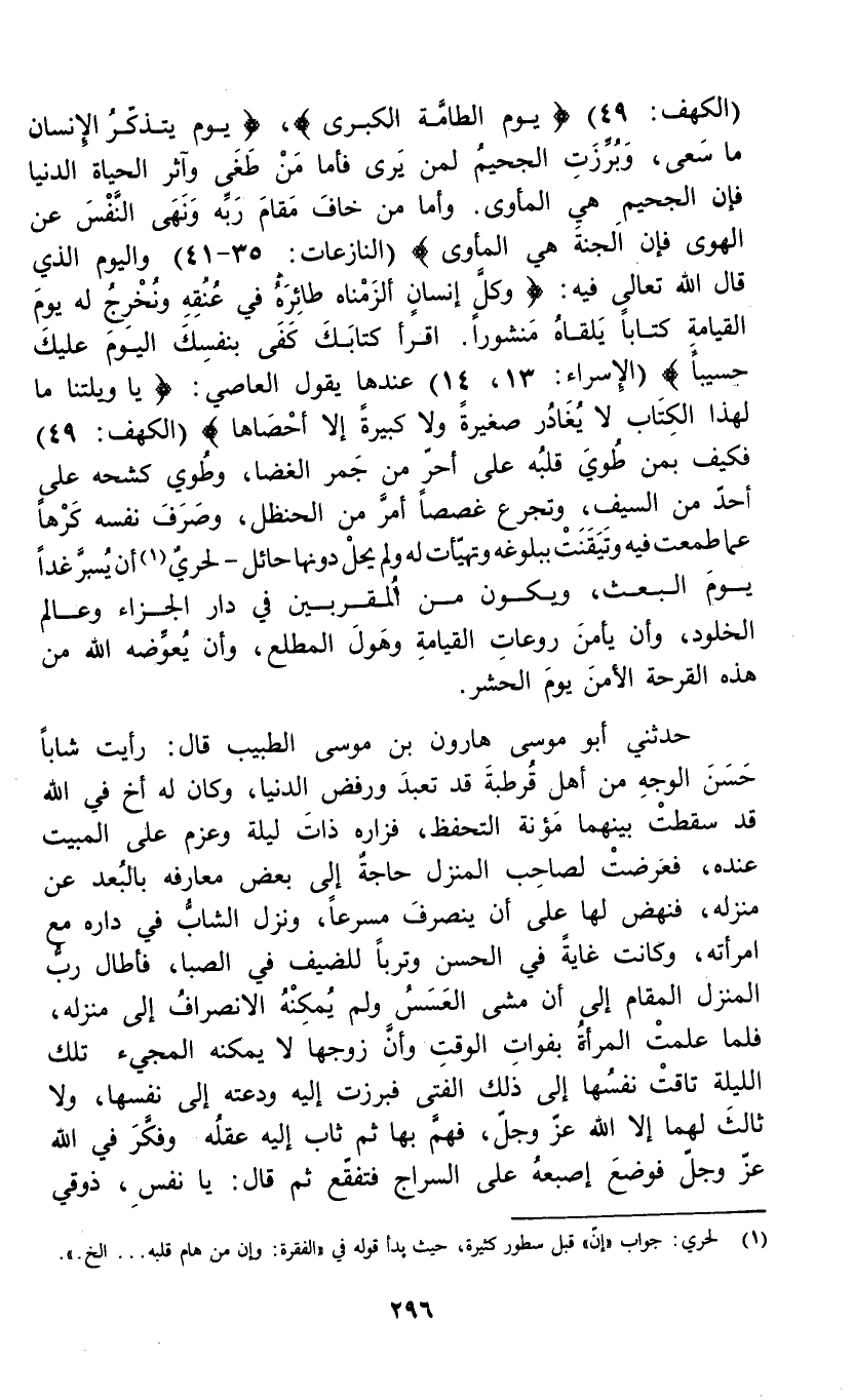 (الكهف: 49) {يوم الطامة الكبرى} ، {يوم يتذكر الإنسان ما سعى، وبرزت الجحيم لمن يرى فأما من طغى وآثر الحياة الدنيا فإن الجحيم هي المأوى. وأما من خاف مقام ربه ونهى النفس عن الهوى فإن الجنة هي المأوى} (النازعات: 35 - 41) واليوم الذي قال الله تعالى فيه: {وكل إنسان ألزمناه طائره في عنقه ونخرج له يوم القيامة كتاباً يلقاه منشوراً. اقرأ كتابك كفى بنفسك اليوم عليك حسيباً} (الإسراء: 13، 14) عندها يقول العاصي: {يا ويلتنا ما لهذا الكتاب لا يغادر صغيرة ولا كبيرة إلا أحصاها} (الكهف: 49) فكيف بمن طوي قلبه على أحر من جمر الغضا، وطوي كشحه على أحد من السيف، وتجرح غصصاً أمر من الحنظل، وشرف نفسه كرها عما طمعت فيه وتيقنت ببلوغه وتهيأت له ولم يحل دونها حائل - لحري (1) أن يسر غداً يوم البعث، ويكون من المقربين في دار الجزاء وعالم الخلود، وأن يأمن روعات القيامة وهول المطلع، وان يعوضه الله من هذه القرحة الأمن يوم الحشر.