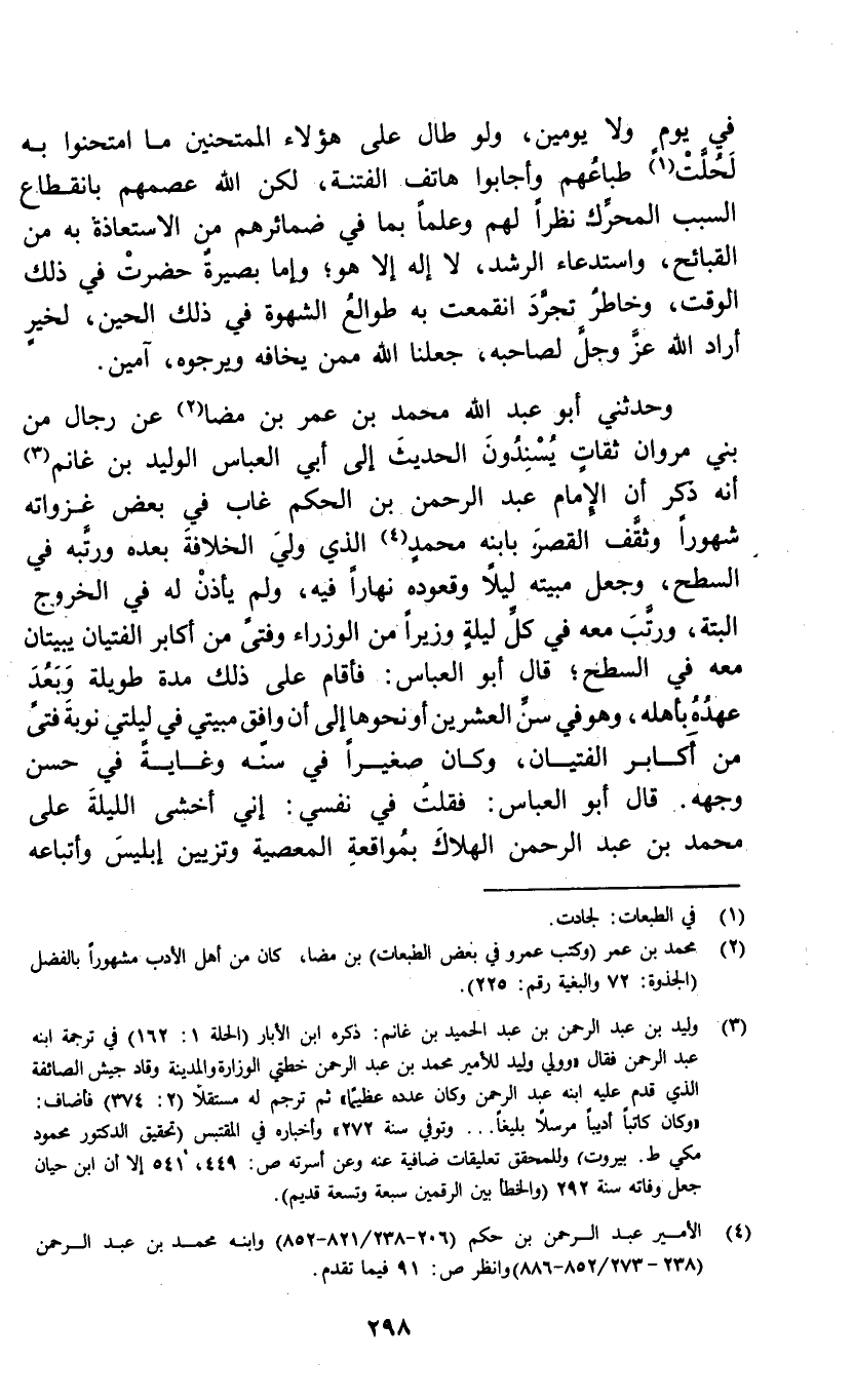 وحدثني أبو عبد الله محمد بن عمر بن مضا (2) عن رجال من بني مروان ثقات يسندون الحديث إلى أبي العباس الوليد بن غانم (3) أنه ذكر أن الإمام عبد الرحمن بن الحكم غاب في بعض غزواته شهوراً وثقف القصر بابنه محمد (4) الذي ولي الخلافة بعده ورتبه في السطح، وجعل مبيته ليلاً وقعوده نهاراً فيه، ولم يأذن له في الخروج البتة، ورتب معه في كل ليلة وزيراً وفتى من أكابر الفتيان يبيتان معه في السطح؛ قال أبو العباس: فأقام على ذلك مدة طويلة وبعد عهده بأهله، وهو في سن العشرين أو نحوها إلى أن وافق مبيتي في ليلتي نوبة فتى من أكابر الفتيان، وكان صغيراً في سنه وغاية في حسن وجهه. قال أبو العباس: فقلت في نفسي: إني أخشى الليلة على محمد بن عبد الرحمن الهلاك بمواقعة المعصية وتزيين إبليس وأتباعه