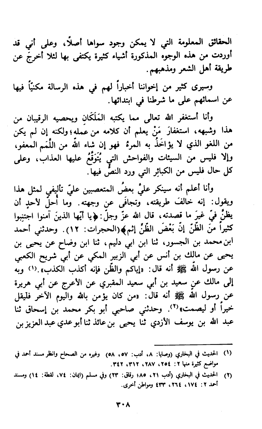 وأنا أعلم أنه سينكر علي بعض المتعصبين علي تألفي لمثل هذا ويقول: إنه خالف طريقته، وتجافى عن وجهته. وما أحل لأحد أن يظن في غير ما قصدته، قال الله عز وجل: {يا أيها الذين آمنوا اجتنبوا كثيراً من الظن إن بعض الظن إثم} (الحجرات: 12) . وحدثني أحمد ابن محمد بن الجسور، ثنا ابن أبي دليم، ثنا ابن وضاح عن يحيى بن يحيى عن مالك بن أنس عن أبي الزبير المكي عن أبي شريح الكعبي عن رسول الله صلى الله عليه وسلم أنه قال: " إياكم والظن فإنه أكذب الكذب ". (1) وبه إلى مالك عن سعيد بن أبي سعيد المقبري عن الأعرج عن أبي هريرة عن رسول الله صلى الله عليه وسلم أنه قال: " من كان يؤمن بالله واليوم الآخر فليقل خيراً أو ليصمت (2) . وحدثني صاحبي أبو بكر محمد بن إسحاق ثنا عبد الله بن يوسف الأزدي ثنا يحيى بن عائذ ثنا أبو عدي عبد العزيز بن