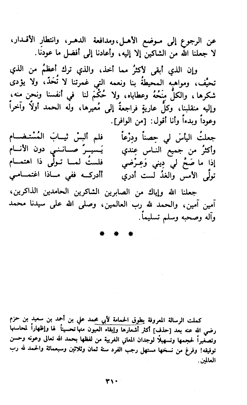 عن الرجوع إلى موضع الأهل، ومدافعة الدهر، وانتظار الأقدار، لا جعلنا الله من الشاكين إلا إليه، وأعادنا إلى أفضل ما عودنا.