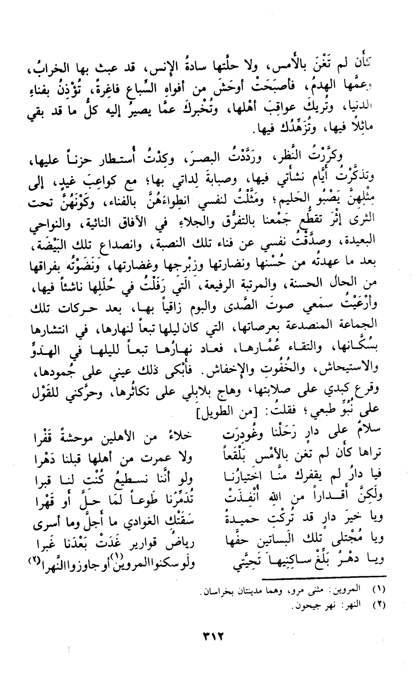 وكررت النظر، ورددت البصر، وكدت استطار حزناً عليها، وتذكرت أيام نشأتي فيها، وصبابة لداتي بها؛ مع كواعب غيد، إلى مثلهن يصبو الحليم؛ ومثلت لنفسي انطواءهن بالفناء، وكونهن تحت الثرى إثر تقطع جمعنا بالتفرق والجلاء في الآفاق النائية، والنواحي البعيدة، وصدقت نفسي عن فناء تلك النصبة، وانصداع تلك البيضة، بعد ما عهدته من حسنها ونضارتها وزبرجها وغضارتها، ونضوته بفراقها من الحال الحسنة، والمرتبة الرفيعة، التي رفلت في حللها ناشئاً فيها، وأرعيت سمعي صوت الصدى والبوم زاقياً بها، بعد حركات تلك الجماعة المنصدعة بعرصاتها، التي كان ليلها تبعاً لنهارها، في انتشارها بسكانها، والتقاء عمارها، فعاد نهارها تبعاً لليلها في الهدو والاستيحاش، والخفوت والإخفاش. فأبكى ذلك عيني على جمودها، وقرع كبدي على صلابتها، وهاج بلابلي على تكاثرها، وحركني للقول على نبو طبعي؛ فقلت: [من الطويل]