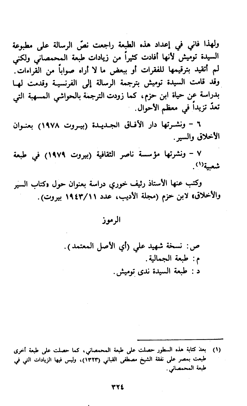 ولهذا فاني في إعداد هذه الطبعة راجعت نص الرسالة على مطبوعة السيدة توميش لأنها أفادت كثيراً من زيادات طبعة المحمصاني ولكني لم أتقيد بترقيمها للفقرات أو ببعض ما لا أراه صواباً من القراءات. وقد قامت السيدة توميش بترجمة الرسالة إلى الفرنسية وقدمت لها بدراسة عن حياة ابن حزم، كما زودت الترجمة بالحواشي المسهبة التي تعد تزيداً في معظم الأحوال.