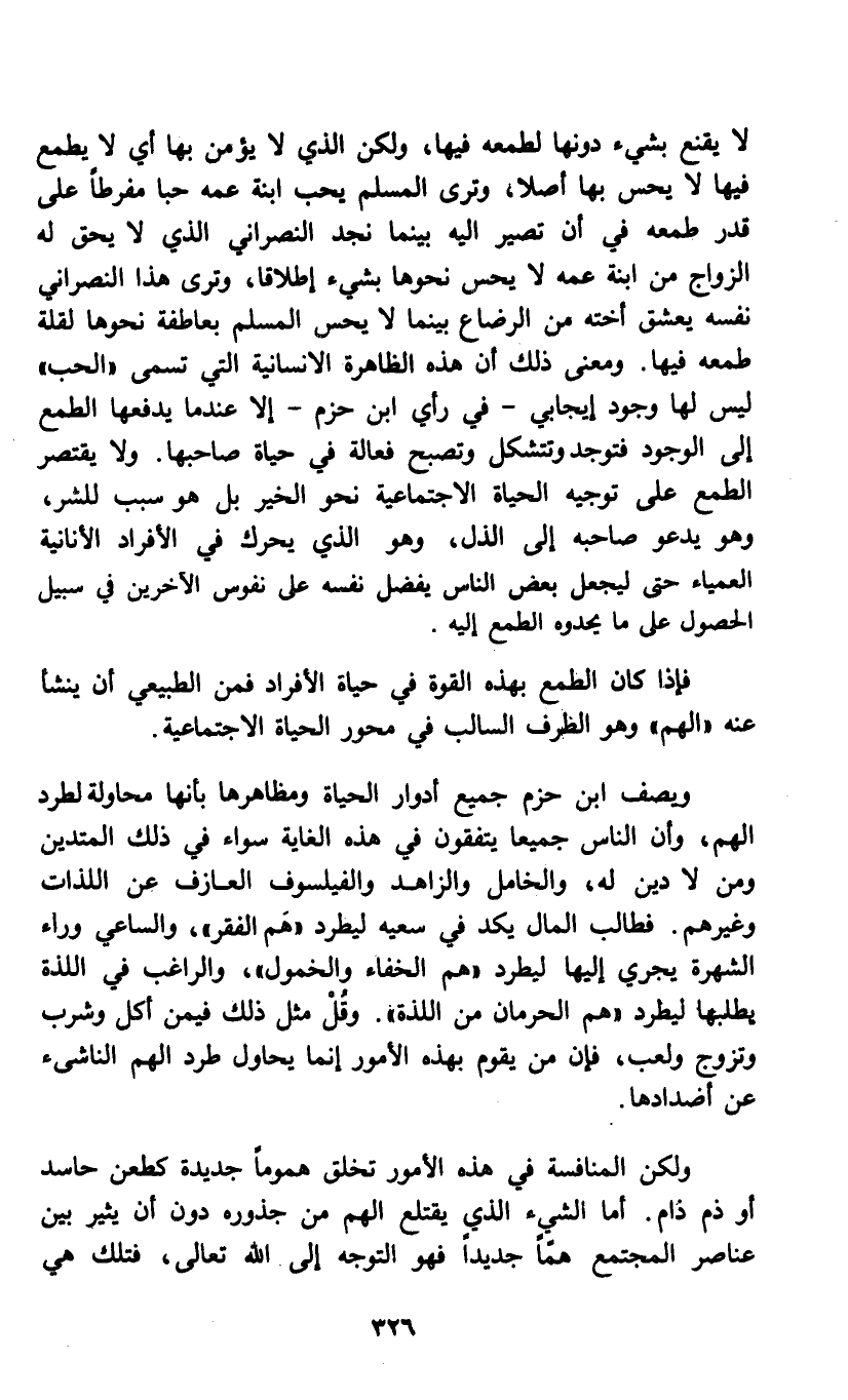 لا يقنع بشيء دونها لطمعه فيها، ولكن الذي لا يؤمن بها أي لا يطمع فيها لا يحس بها أصلا، وترى المسلم يحب ابنة عمه حبا مفرطاً على قدر طمعه في أن تصير اليه بينما نجد النصراني الذي لا يحق له الزواج من ابنة عمه لا يحس نحوها بشيء إطلاقاً، وترى هذا النصراني نفسه يعشق أخته من الرضاع بينما لا يحس المسلم بعاطفة نحوها لقلة طمعه فيها. ومعنى ذلك أن هذه الظاهرة الانسانية التي تسمى " الحب " ليس لها وجود إيجابي - في رأي ابن حزم - إلا عندما يدفعها الطمع إلى الوجود فتوجد وتتشكل وتصبح فعالة في حياة صاحبها. ولا يقتصر الطمع على توجيه الحياة الاجتماعية نحو الخير بل هو سبب للشر، وهو يدعو صاحبه إلى الذل، وهو الذي يحرك في الأفراد الأنانية العمياء حتى ليجعل بعض الناس يفضل نفسه على نفوس الآخرين في سبيل الحصول على ما يحدوه الطمع إليه.