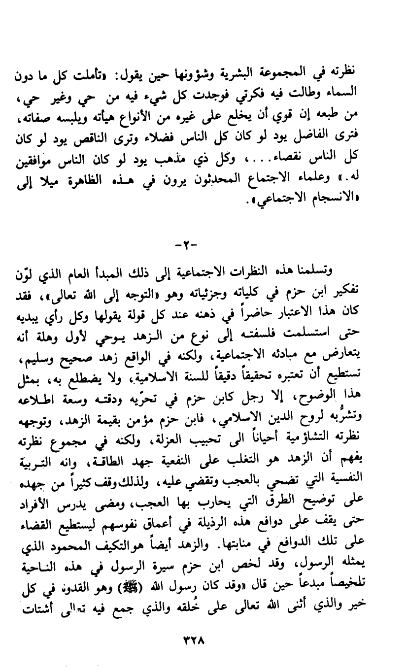 وتسلمنا هذه النظرات الاجتماعية إلى ذلك المبدأ العام الذي لون تفكير ابن حزم في كلياته وجزئياته وهو " التوجه إلى الله تعالى "، فقد كان هذا الاعتبار حاضراً في ذهنه عند كل قولة يقولها وكل رأي يبديه حتى استسلمت فلسفته إلى نوع من الزهد يوحي لأول وهلة أنه يتعارض مع مبادئه الاجتماعية، ولكنه في الواقع زهد صحيح وسليم، تستطيع أن تعبيره تحقيقاً دقيقاً للسنة الاسلامية، ولا يضطلع به، بمثل هذا الوضوح، إلا رجل كابن حزم في تحريه ودقته وسعة اطلاعه وتشربه لروح الدين الاسلامي، فابن حزم مؤمن بقيمة الزهد، وتوجهه نظرته التشاؤمية أحياناً إلى تحبيب العزلة، ولكنه في مجموع نظرته يفهم أن الزهد هو التغلب على النفعية جهد الطاقة، وانه التربية النفسية التي تضحي بالعجب وتقضي عليه، ولذلك وقف كثيراً من جهده على توضيح الطرق التي يحارب بها العجب، ومضى يدرس الأفراد حتى يقف على دوافع هذه الرذيلة في أعماق نفوسهم ليستطيع القضاء على تلك الدوافع في منابتها. والزهد أيضاً هو التكيف المحمود الذي يمثله الرسول، وقد لخص ابن حزم سيرة الرسول في هذه الناحية تلخيصاً مبدعاً حين قال " وقد كان رسول الله (صلى الله عليه وسلم) وهو القدوة في كل خير والذي أثنى الله تعالى على خلقه والذي جمع فيه تعالى أشتات