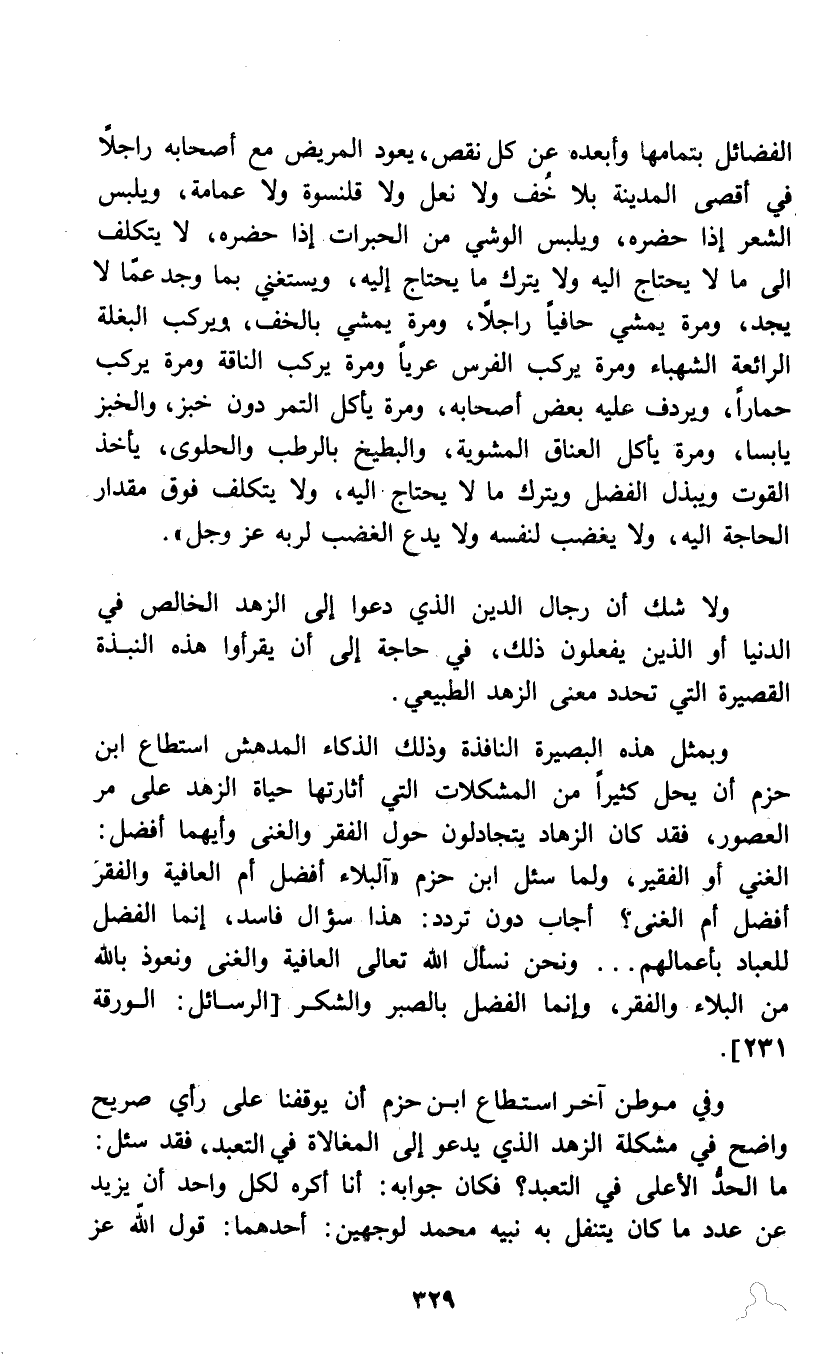 وبمثل هذه البصيرة النافذة وذلك الذكاء المدهش استطاع ابن حزم أن يحل كثيراً من المشكلات التي أثارتها حياة الزهد على مر العصور، فقد كان الزهاد يتجادلون حول الفقر والغنى وأيهما أفضل: الغني أو الفقير، ولما سئل ابن حزم " آلبلاء أفضل أم العافية والفقر أفضل أم الغنى أجاب دون تردد: هذا سؤال فاسد، إنما الفضل للعباد بأعمالهم ونحن نسأل الله تعالى العافية والغنى ونعوذ بالله من البلاء والفقر، وإنما الفضل بالصبر والشكر [الرسائل: الورقة 231] .
