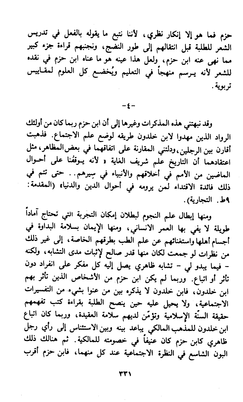 ومنها إبطال علم النجوم لبطلان إمكان التجربة التي تحتاج آماداً طويلة لا يفي بها العمر الانساني، ومنها الإيمان بسلامة البداوة في أجسام أهلها واستغنائهم عن علم الطب بطرقهم الخاصة، إلى غير ذلك من نظرات لو جمعت لكان منها قدر صالح لإثبات مدى التشابه، ولكنه فيما يبدو لي - تشابه ظاهري يصل إليه كل مفكر على انفراد دون تأثر أو اتباع. وربما لم يكن ابن حزم من الأشخاص الذي تأثر بهم ابن خلدون، فابن خلدون لا يذكره بين من عنوا بشيء من التفسيرات الاجتماعية، ولا يحيل عليه حين ينصح الطلبة بقراءة كتب تفهمهم حقيقة السنة الإسلامية وتؤمن لديهم سلامة العقيدة، وربما كان اتباع ابن خلدون للمذهب المالكي يباعد بينه وبين الاستئناس إلى رأي رجل ظاهري كابن حزم كان عنيفاً في خصومه للمالكية. ثم هنالك ذلك البون الشاسع في النظرة الاجتماعية عند كل منهما، فابن حزم أقرب