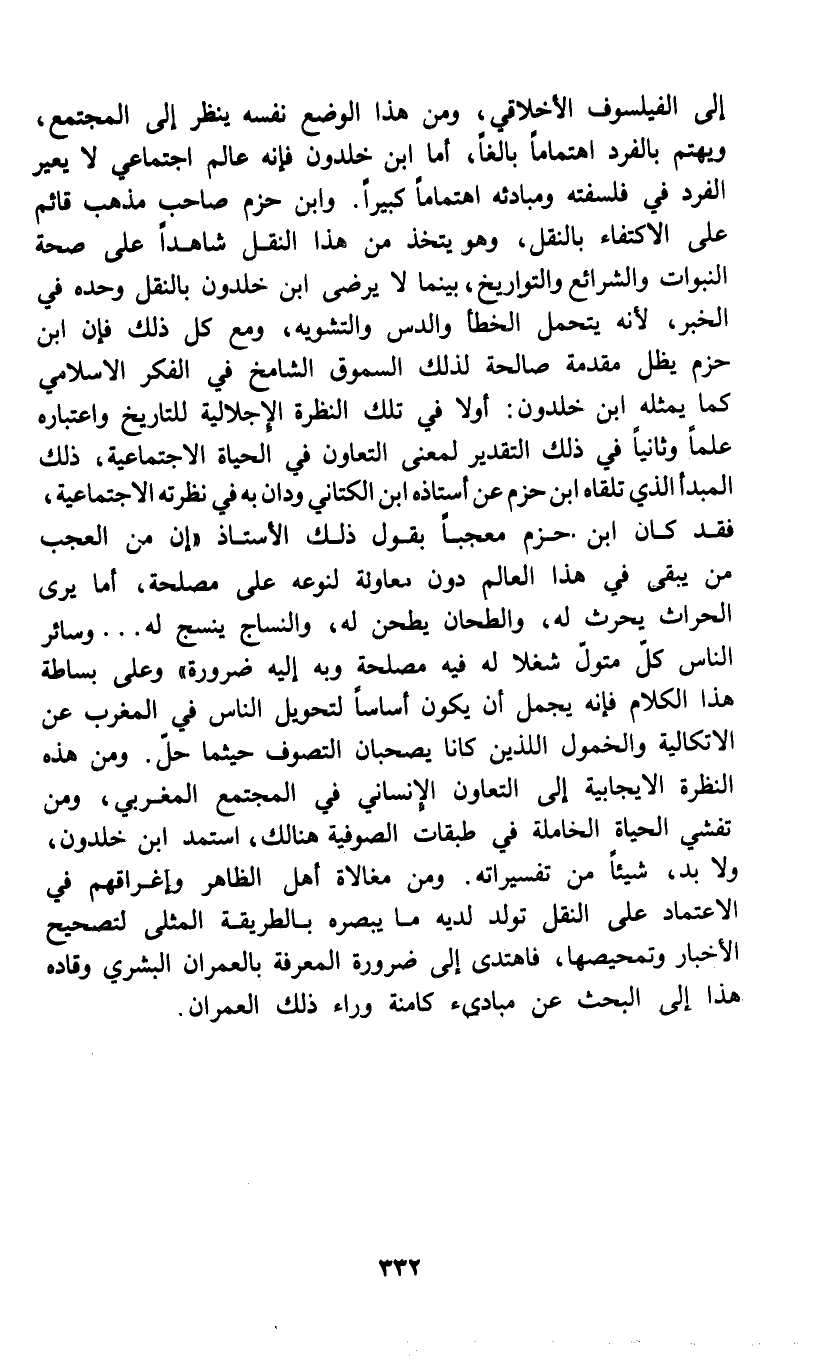 إلى الفيلسوف الأخلاقي، ومن هذا الوضع نفسه ينظر إلى المجتمع، ويهتم بالفرد اهتماماً بالغاً، أما ابن خلدون فإنه عالم اجتماعي لا يعبر الفرد في فلسفته ومبادئه اهتماماً كبيراً. وابن حزم صاحب مذهب قائم على الاكتفاء بالنقل، وهو يتخذ من هذا النقل شاهداً على صحة النبوات والشرائع والتواريخ، بينما لا يرضى ابن خلدون بالنقل وحده في الخبر، لأنه يتحمل الخطأ والدس والتشويه، ومع كل ذلك فإن ابن حزم يظل مقدمة صالحة لذلك السموق الشامخ في الفكر الاسلامي كما يمثله ابن خلدون: أولا في تلك النظرة الإجلالية للتاريخ واعتباره علماً وثانياً في ذلك التقدير لمعنى التعاون في الحياة الاجتماعية، ذلك المبدأ الذي تلقاه ابن حزم عن أستاذه ابن الكتاني ودان به في نظرته الاجتماعية، فقد كان ابن حزم معجباً بقول ذلك الأستاذ " إن من العجب من يبقى في هذا العالم دون معاونة لنوعه على مصلحة، أما يرى الحراث يحرث له، والطحان يطحن له، والنساج ينسج له وسائر الناس كل متول شغلا له فيه مصلحة وبه إليه ضرورة " وعلى بساطة هذا الكلام فإنه يجمل أن يكون أساساً لتحويل الناس في المغرب عن الاتكالية والخمول اللذين كانا يصحبان التصوف حيثما حل. ومن هذه النظرة الايجابية إلى التعاون الإنساني في المجتمع المغربي، ومن تفشي الحياة الخاملة في طبقات الصوفية هنالك، استمد ابن خلدون، ولابد، شيئاً من تفسيراته. ومن مغالاة أهل الظاهر وإغراقهم في الاعتماد على النقل تولد لديه ما يبصره بالطريقة المثلى لتصحيح الأخبار وتمحيصها، فاهتدى إلى ضرورة المعرفة بالعمران البشري وقاده هذا إلى البحث عن مبادئ كامنة وراء ذلك العمران.