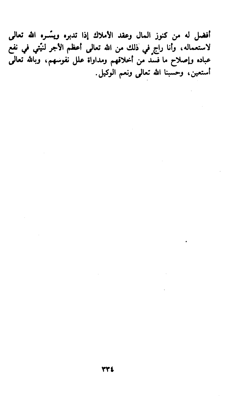 أفضل له من كنوز المال وعقد الأملاك إذا تدبره ويسره الله تعالى لاستعماله، وأنا راج في ذلك من الله تعالى أعظم الأجر لنيتي في نفع عباده وإصلاح ما فسد من أخلاقهم ومداواة علل نفوسهم، وبالله تعالى أستعين، وحسبنا الله تعالى ونعم الوكيل.