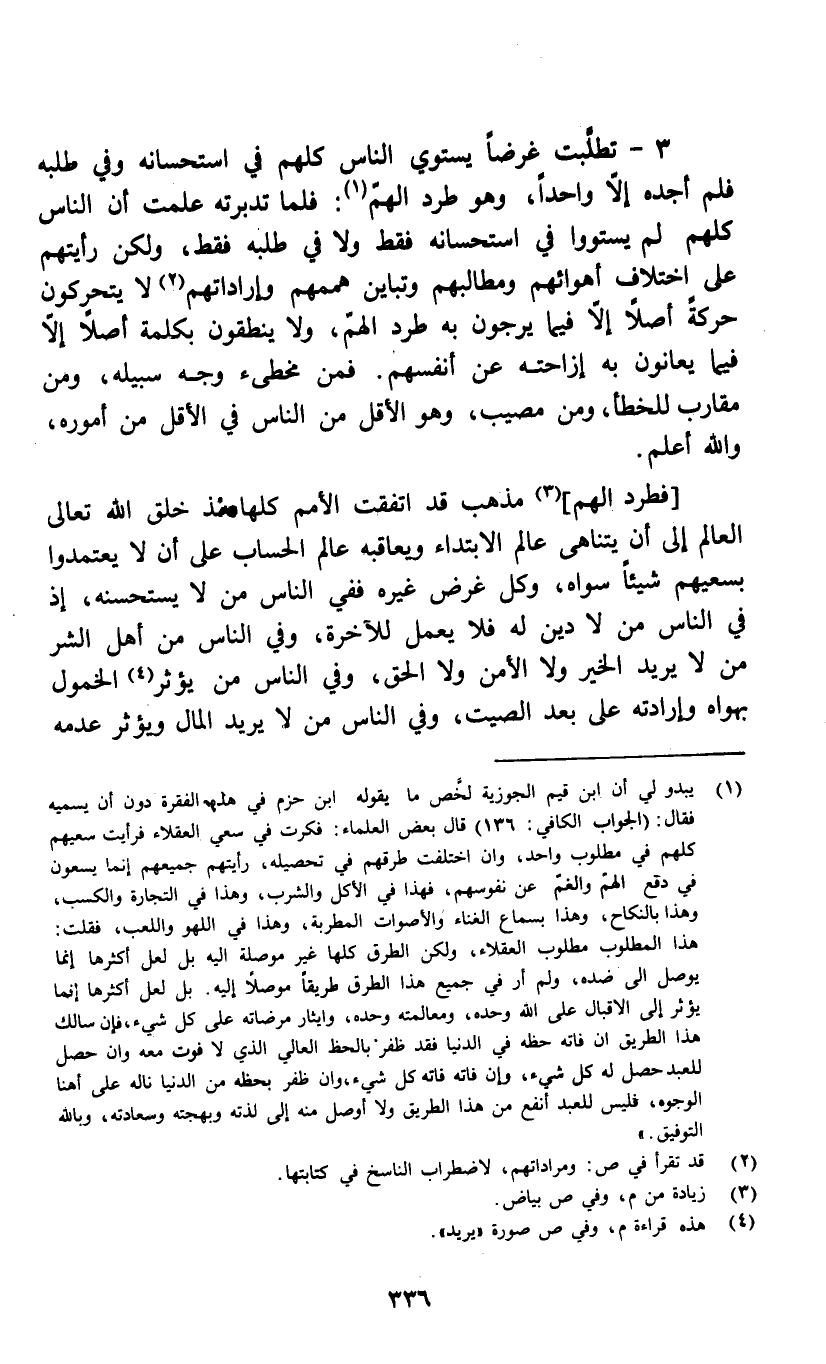 3 - تطلبت غرضاً يستوي الناس كلهم في استحسانه وفي طلبه فلم أجده إلا واحداً، وهو طرد الهم (1) : فلما تدبرته علمت أن الناس كلهم لم يستووا في استحسانه فقط ولا في طلبه فقط، ولكن رأيتهم على اختلاف أهوائهم ومطالبهم هممهم وإراداتهم (2) لا يتحركون حركة أصلاً إلا فيما يرجون به طرد الهم، ولا ينطقون بكلمة أصلاً إلا فيما يعانون به إزاحته عن أنفسهم. فمن مخطئ وجه سبيله، ومن مقارب للخطأ، ومن مصيب، وهو الأقل من الناس في الأقل من أموره، والله اعلم.