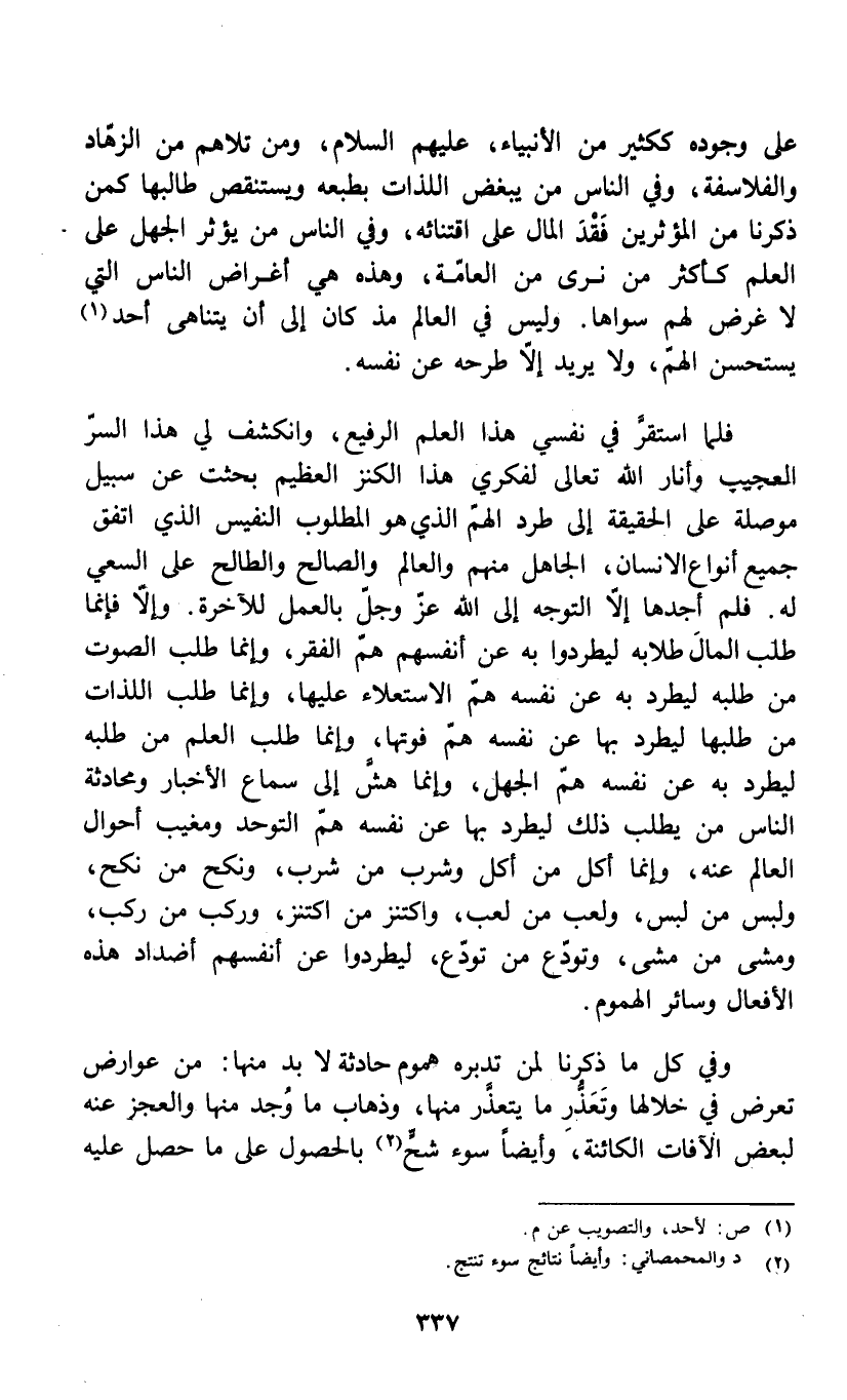 فلما استقر في نفسي هذا العلم الرفيع، وانكشف لي هذا السر العجيب وأنار الله تعالى لفكري هذا الكنز العظيم بحثت عن سبيل موصلة على الحقيقة إلى طرد الهم الذي هو المطلوب النفيس الذي اتفق جميع أنواع الانسان، الجاهل منهم والعالم والصالح والطالح على السعي له. فلم أجدها إلا التوجه إلى الله عز وجل بالعمل للآخرة. وإلا فإنما طلب المال طلابه ليطردوا به عن أنفسهم هم الفقر، وإنما طلب الصوت من طلبه ليطرد به عن نفسه هم الاستعلاء عليها، وإنما طلب اللذات من طلبها ليطرد به عن نفسه هم الجهل، وإنما هش إلى سماع الأخبار ومحادثة الناس من يطلب ذلك ليطرد بها عن نفسه هم التوحد ومغيب أحوال العالم عنه، وإنما أكل من أكل وشرب من شرب، ونكح من نكح، ولبس من لبس، ولعب من لعب، واكتنز من اكتنز، وركب من ركب، ومشى من مشى، وتودع من تودع، ليطردوا عن أنفسهم أضداد هذه الأفعال وسائر الهموم.