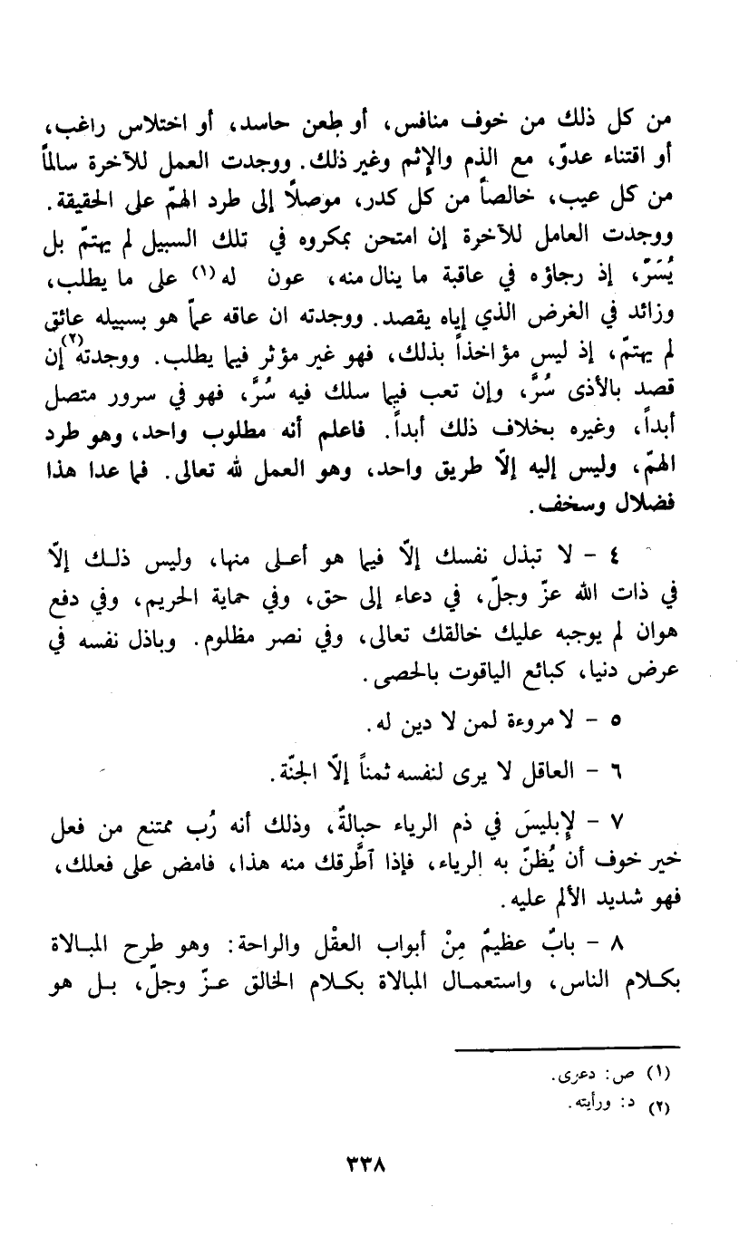 من كل ذلك من خوف منافس، أو طعن حاسد، أو اختلاس راغب، أو اقتناء عدو، مع الذم والإثم وغير ذلك. ووجدت العمل للآخرة سالماً من كل عيب، خالصاً من كل كدر، موصلاً إلى طرد الهم على الحقيقة. ووجدت العامل للآخرة إن امتحن بمكروه في تلك السبيل لم يهتم بل يسر، إذ رجاؤه في عاقبة ما ينال منه، عون له (1) على ما يطلب، لم يهتم، إذ ليس مؤاخذاً بذلك، فهو غير مؤثر فيما يطلب. ووجدته (2) إن قصد بالأذى سر، وإن تعب فيما سلك فيه سر، فهو في سرور متصل أبداً، وغيره بخلاف ذلك أبداً. فاعلم أنه مطلوب واحد، وهو طرد الهم، وليس إليه طريق واحد، وهو العمل لله تعالى. فما عدا هذا فضلال وسخف.