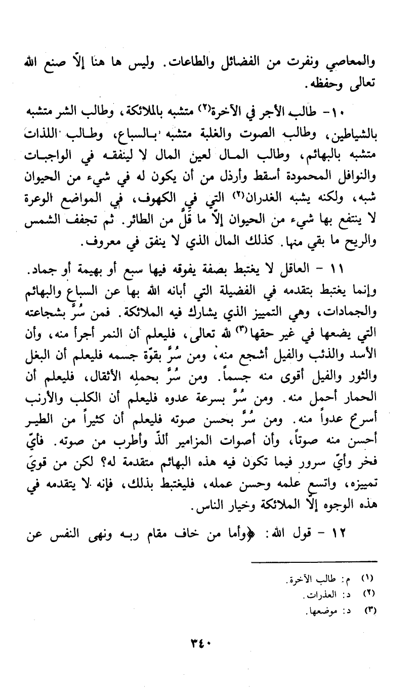 10 - طالب الأجر في الآخرة (1) متشبه بالملائكة، وطالب الشر متشبه بالشياطين، وطالب الصوت والغلبة متشبه بالسباع، وطالب اللذات متشبه بالبهائم، وطالب المال لعين المال لا لينفقه في الواجبات والنوافل المحمودة أسقط وأرذل من أن يكون له في شيء من الحيوان شبه، ولكنه يشبه الغدران (2) التي في الكهوف، في المواضع الوعرة لا ينتفع بها شيء من الحيوان إلا ما قل من الطائر. ثم تجفف الشمس والريح ما بقي منها. كذلك المال الذي لا ينفق في معروف.