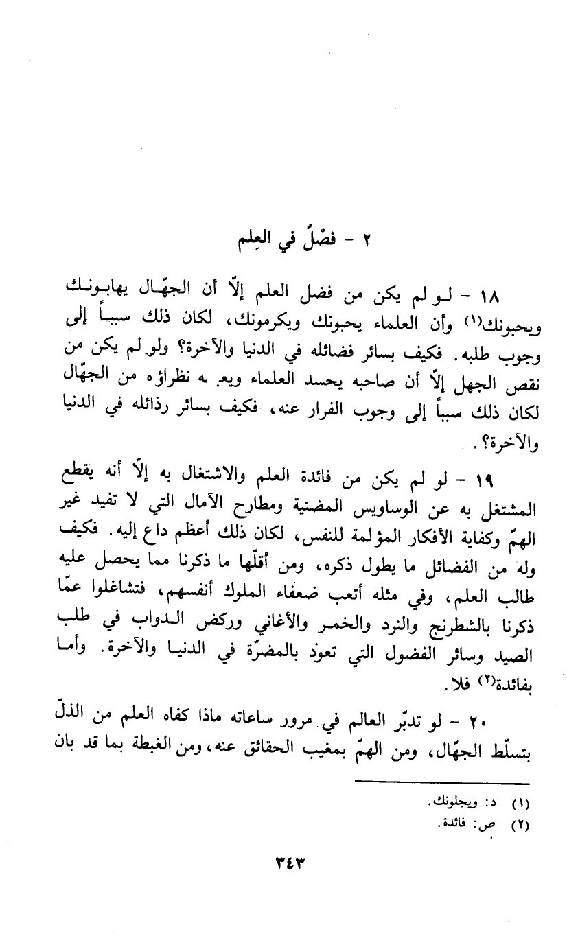 19 - لو لم يكن من فائدة العلم والاشتغال به إلا أنه يقطع المشتغل به عن الوساويس المضنية ومطارح الآمال التي لا تفيد غير الهم وكفاية الأفكار المؤلمة للنفس، لكان ذلك أعظم داع إليه. فكيف وله من الفضائل ما يطول ذكره، ومن أقلها ما ذكرنا مما يحصل عليه طالب العلم، وفي مثله أتعب ضعفاء الملوك أنفسهم، فتشاغلوا عما ذكرنا بالشطرنج والنرد والخمر والأغاني وركض الدواب في طلب الصيد وسائر الفضول التي تعود بالمضرة في الدنيا والآخرة. وأما بفائدة (2) فلا.
