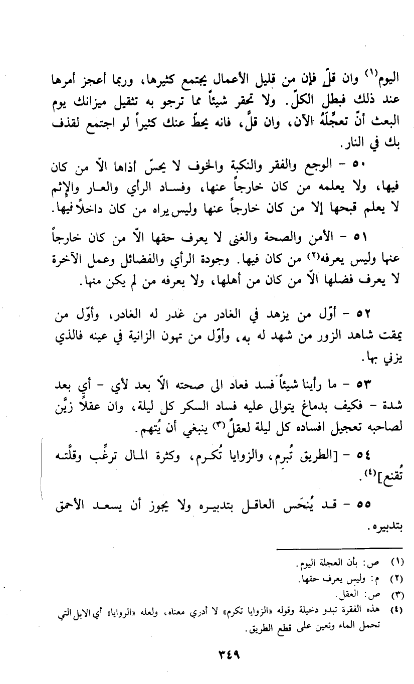 53 - ما رأينا شيئاً فسد فعاد إلى صحته الا بعد لأي - أي بعد شدة - فكيف بدماغ يتوالى عليه فساد السكر كل ليلة، وان عقلاً زين لصاحبه تعجيل افساده كل ليلة لعقل (3) ينبغي أن يتهم.