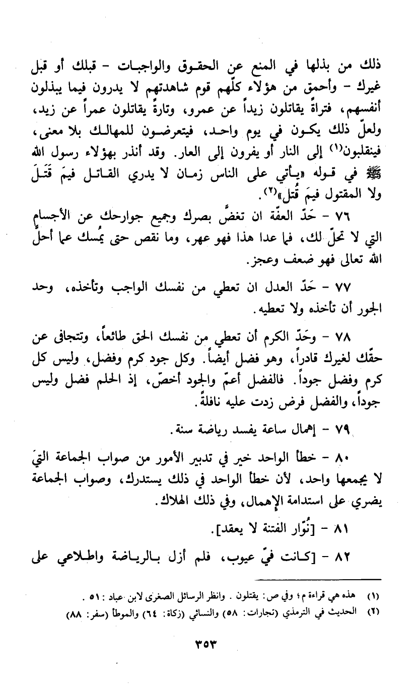 76 - حد العفة ان تغض بصرك وجميع جوارحك عن الأجسام التي لا تحل لك، فما عدا هذا فهو عهر، وما نقص حتى يمسك عما أحل الله تعالى فهو ضعف وعجز.