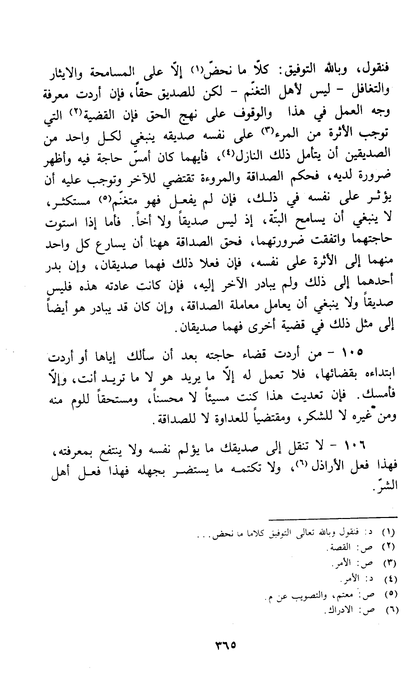فنقول، وبالله التوفيق: كلا ما نحض (1) إلا على المسامحة والايثار والتغافل - ليس لأهل التغنم - لكن للصديق حقاً، فإن أردت معرفة وجه العمل في هذا والوقوف على نهج الحق فإن القضية (2) التي توجب الأثرة من المرء (3) على نفسه صديقه ينبغي لكل واحد من الصديقين أن يتأمل ذلك النازل (4) ، فأيهما كان أمس حاجة فيه وأظهر ضرورة لديه، فحكم الصداقة والمروءة تقتضي للآخر وتوجب عليه أن يؤثر على نفسه في ذلك، فأن لم يفعل فهو متغنم (5) مستكثر، لا ينبغي أن يسامح البتة، إذ ليس صديقاً ولا أخاً. فأما إذا استوت حاجتهما واتفقت ضرورتهما، فحق الصداقة ههنا أن يسارع كل واحد منهما إلى الأثرة على نفسه، فإن فعلا ذلك فهما صديقان، وإن بدر أحدهما إلى ذلك ولم يبادر الآخر إليه، فإن كانت عادته هذه فليس صديقاً ولا ينبغي أن يعامل معاملة الصداقة، وإن كان قد يبادر هو أيضاً إلى مثل ذلك في قضية أخرى فهما صديقان.