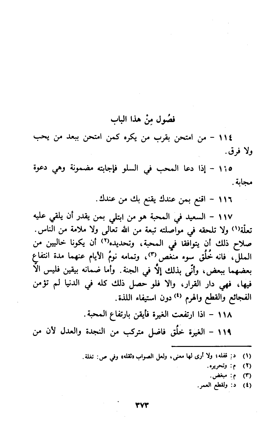 117 - السعيد في المحبة هو من ابتلي بمن يقدر أن يلقي عليه تعلة (1) ولا تلحقه في مواصلته تبعة من الله تعالى ولا ملامة من الناس. صلاح ذلك ان يتوافقا في المحبة، وتحديده (2) أن يكونا خاليين من الملل، فانه خلق سوء منغص (3) ، وتمامه نوم الأيام عنهما مدة انتفاع بعضهما ببعض، وأنى بذلك إلا في الجنة. وأما ضمانه بيقين فليس الا فيها، فهي دار القرار، والا فلو حصل ذلك كله في الدنيا لم تؤمن الفجائع والقطع والهرم (4) دون استيفاء اللذة.