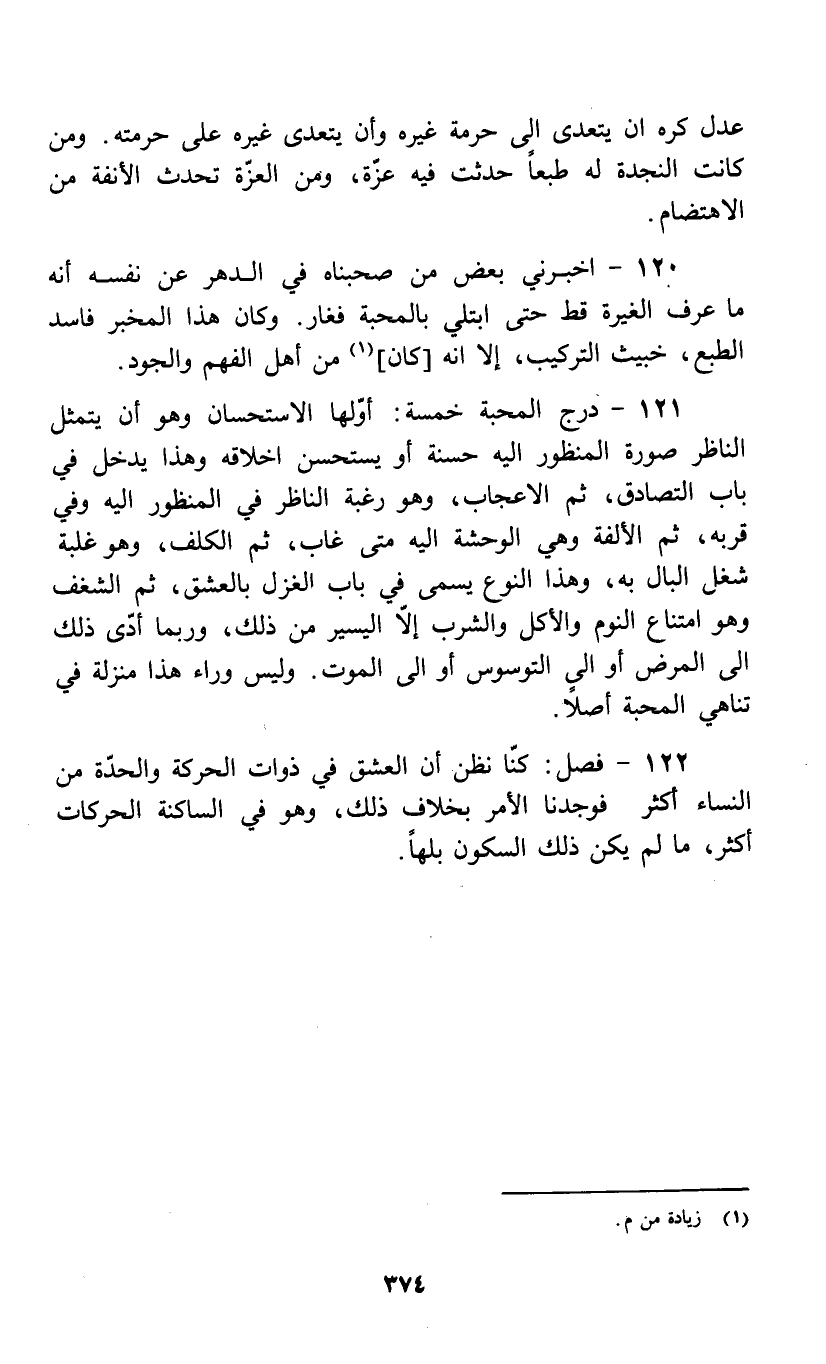 121 - درج المحبة خمسة: أولها الاستحسان وهو أن يتمثل الناظر صورة المنظور اليه حسنة أو يستحسن اخلاقه وهذا يدخل في باب التصادق، ثم الاعجاب، وهو رغبة الناظر في المنظور اليه وفي قربه، ثم الألفة وهي الوحشة اليه متى غاب، ثم الكلف، وهو غلبة شغل البال به، وهذا النوع يسمى في باب الغزل بالعشق، ثم الشغف وهو امتناع النوم والأكل والشرب إلا اليسير من ذلك، وربما أدى ذلك إلى المرض أو إلى التوسوس أو إلى الموت. وليس وراء هذا منزلة في تناهي المحبة أصلاً.