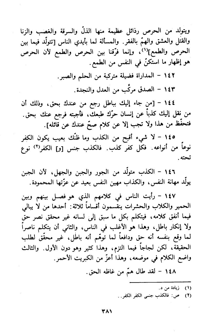 145 - لا شيء أقبح من الكذب وما ظنك بعيب يكون الكفر نوعاً من أنواعه. فكل كفر كذب. فالكذب جنس [و] الكفر (2) نوع تحته.