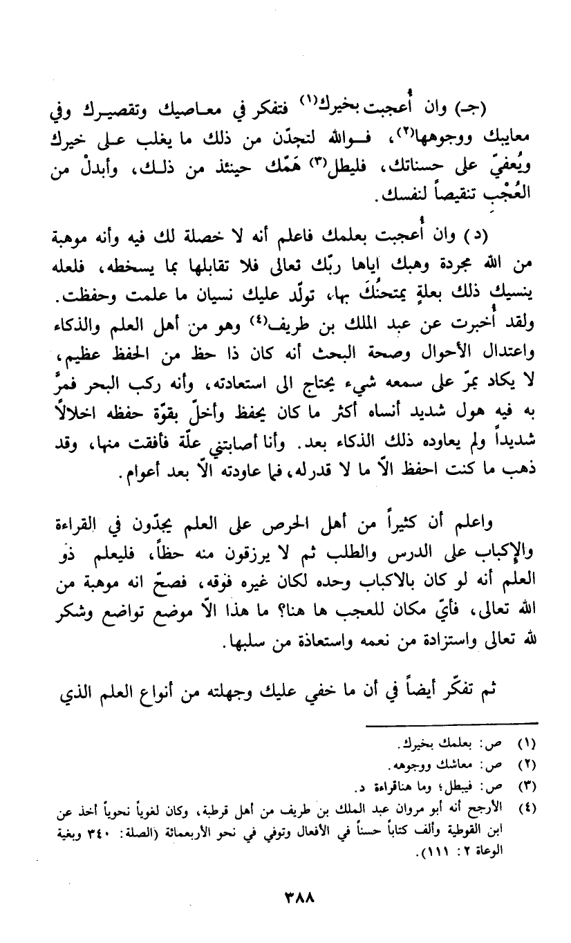 (د) وان أعجبت بعلمك فاعلم أنه لا خصلة لك فيه وأنه موهبة من الله مجردة وهبك اياها ربك تعالى فلا تقابلها بما يسخطه، فلعله ينسيك ذلك بعلة يمتحنك بها، تولد عليك نسيان ما علمت وحفظت. ولقد أخبرت عن عبد الملك بن طريف (4) وهو من أهل العلم والذكاء واعتدال الأحوال وصحة البحث أنه كان ذا حظ من الحفظ عظيم، لا يكاد يمر على سمعه شيء يحتاج إلى استعادته، وأنه ركب البحر فمر به فيه هول شديد أنساه أكثر ما كان يحفظ وأخل بقوة حفظه اخلالاً شديداً ولم يعاوده ذلك الذكاء بعد. وأنا أصابتني علة فأقمت منها، وقد ذهب ما كنت احفظ الا ما لا قدر له، فما عاودته الا بعد أعوام.