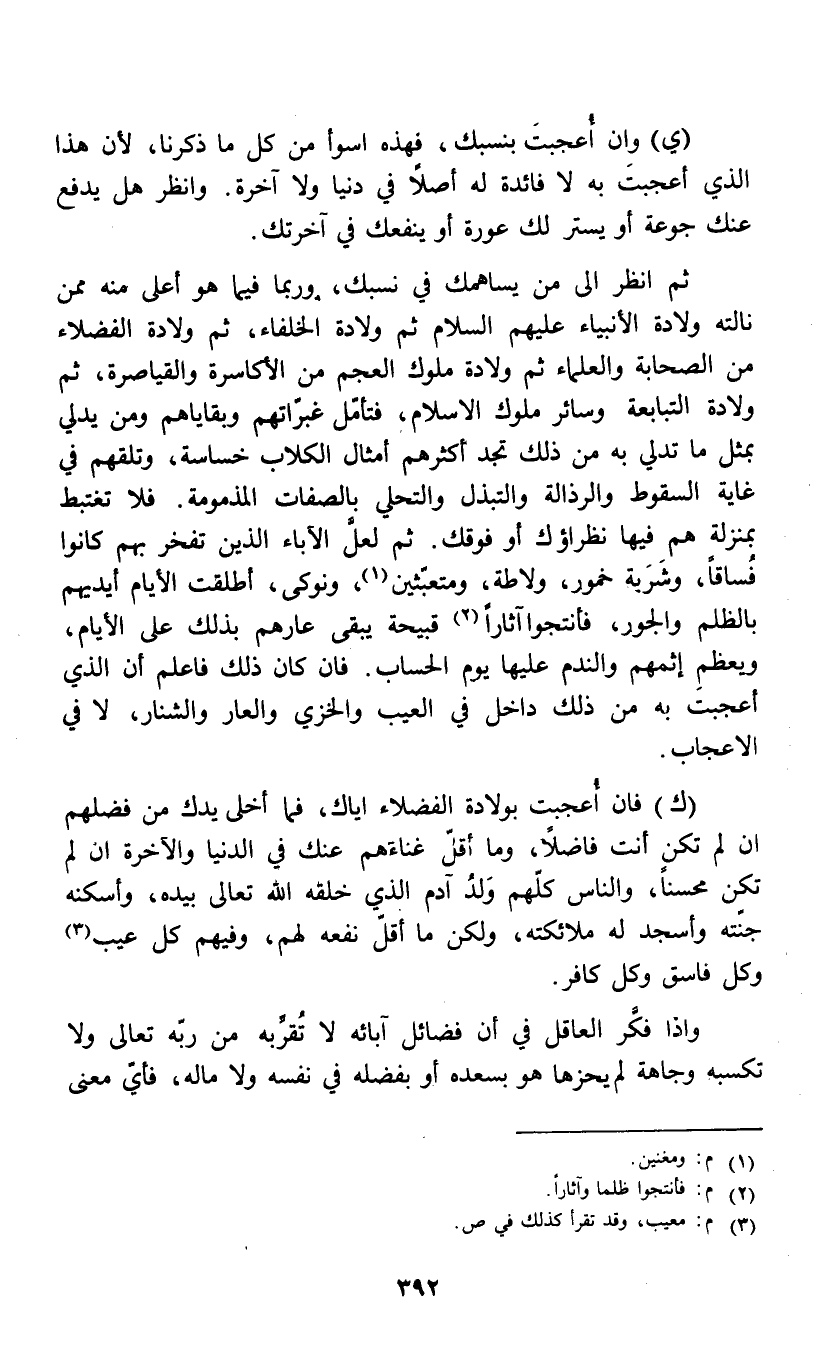 واذا فكر العاقل في أن فضائل آبائه لا تقربه من ربه تعالى ولا تكسبه وجاهة لم يحزها هو بسعده او بفضله في نفسه ولا ماله، فأي معنى