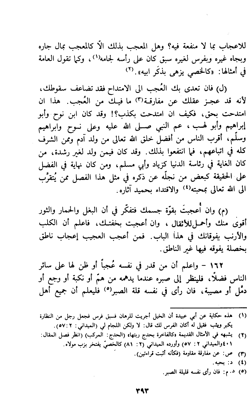 (ل) فان تعدى بك العجب إلى الامتداح فقد تضاعف سقوطك، لأنه قد عجز عقلك عن مفارقة (3) ما فيك من العجب. هذا ان امتدحت بحق، فكيف ان امتدحت بكذب! وقد كان ابن نوح وأبو إبراهيم وأبو لهب، عم النبي صلى الله عليه وعلى نوح وابراهيم وسلم، أقرب الناس من أفضل خلق الله تعالى من ولد آدم وممن الشرف كله في اتباعهم، فما انتفعوا بذلك. وقد كان فيمن ولد لغير رشدة، من كان الغاية في رئاسة الدنيا كزياد وأبي مسلم، ومن كان نهاية في الفضل على الحقيقة كبعض من نجله عن ذكره في مثل هذا الفصل ممن يتقرب إلى الله تعالى بمحبته (4) والاقتداء بحميد آثاره.