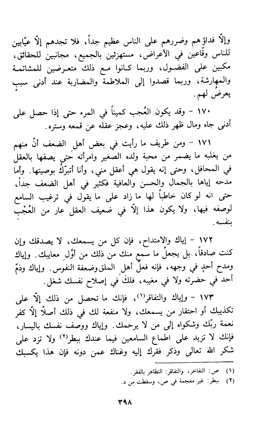 172 - إياك والامتداح، فغن كل من يسمعك، لا يصدقك وإن كنت صادقاً، بل يجعل ما سمع منك من ذلك من أول معايبك، وإياك ومدح أحد في وجهه، فإنه فعل أهل الملق وضعفة النفوس. وإياك وذم أحد في حضرته ولا في مغيبه، فلك في إصلاح نفسك شغل.